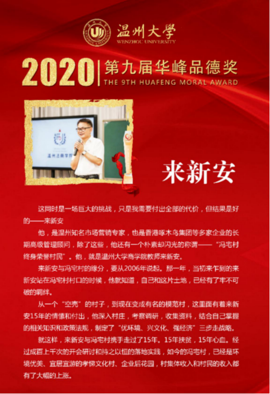 专任教师,你也是冯宅村终生荣誉村民,巍巍师表,你育得桃李香满园,初心不改,你奏响了乡村高速发展的交响曲,建设社会主义新农村,你矢志不渝再出发”,这是组委会给来老师的颁奖词,这份沉甸甸的褒奖,在2020年这个决胜全面建成小康社会的关键年份,更显商院人的担当。