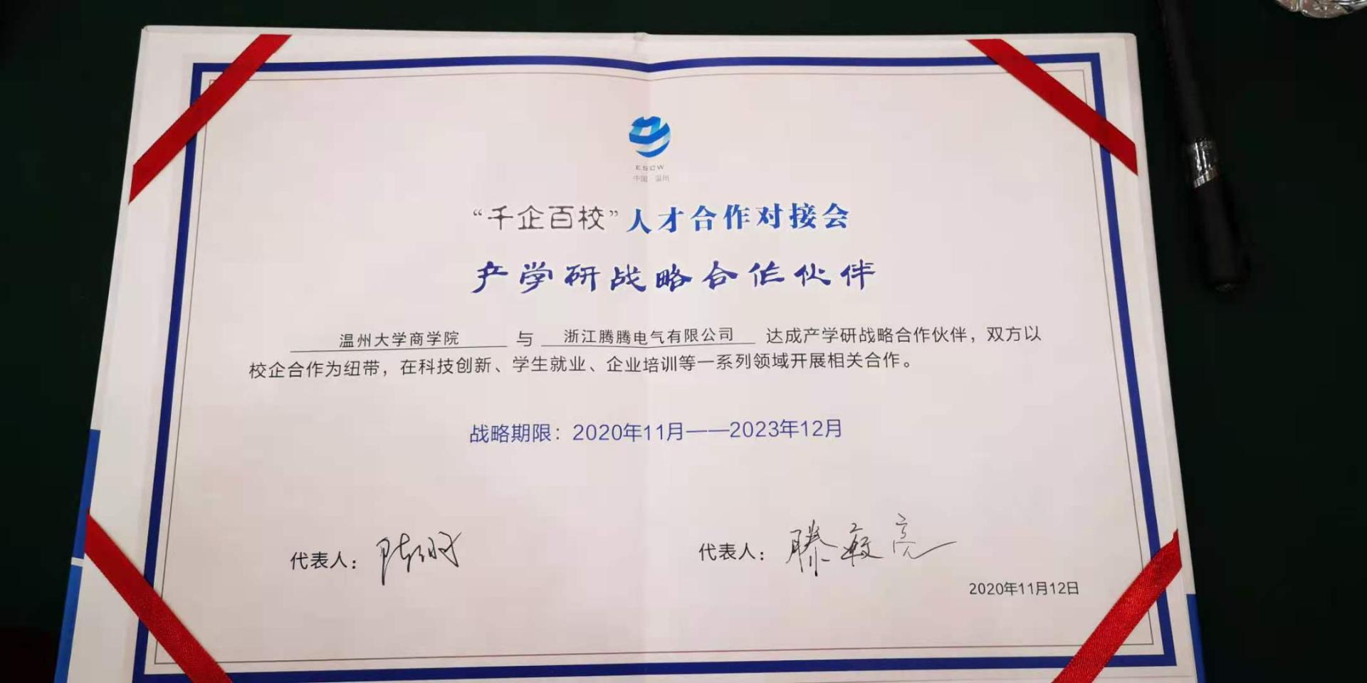 ,与浙江腾腾电气有限公司董事长滕敏亮一起参加了在温州人民大会堂举行的“千企百校”人才合作对接会,并签署了对接协议。