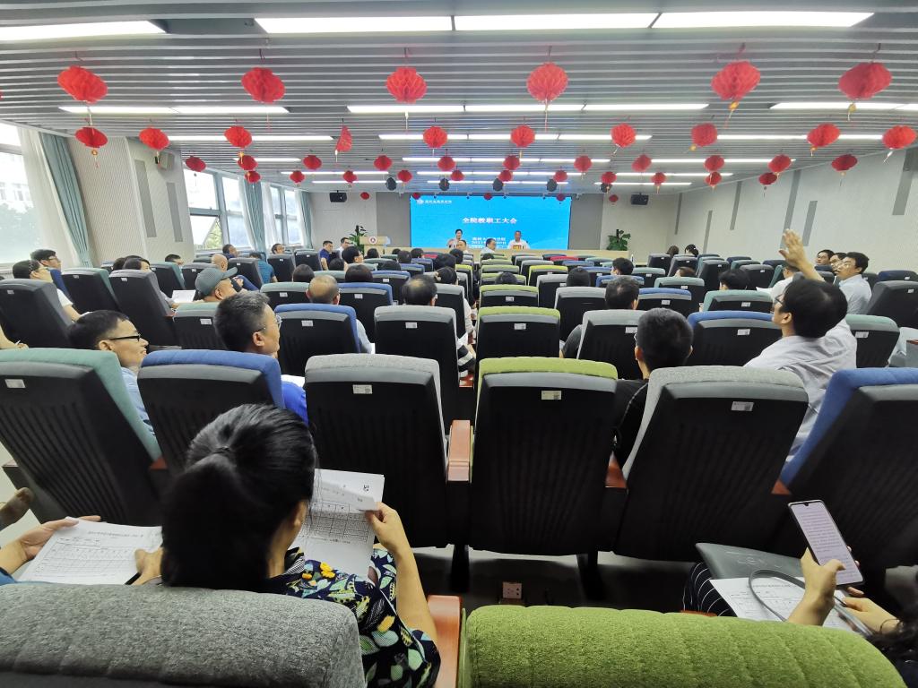 在信息楼A226仲辉商道讲堂召开全院教职工大会,全体教职工参加会议。会议由学院党委书记郑彩莲主持。