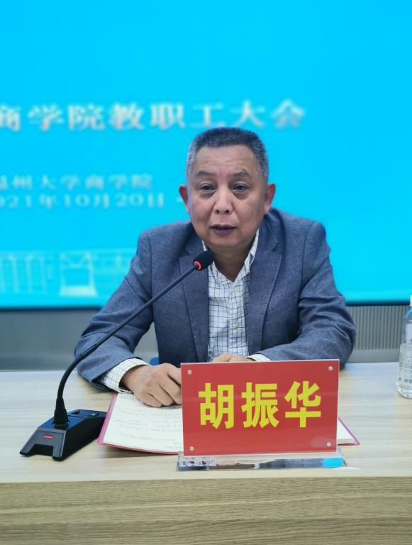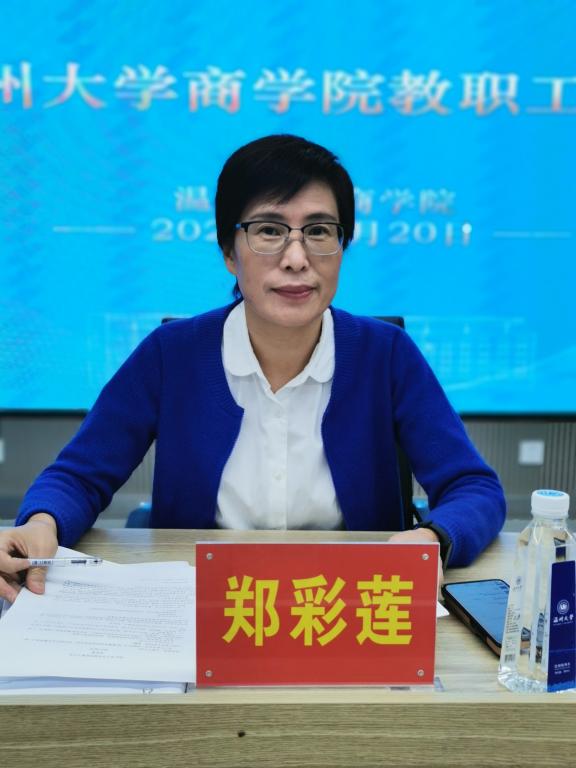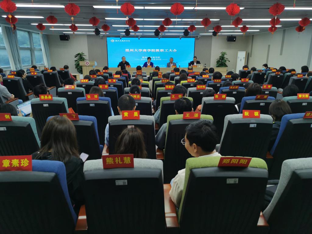 2021年10月20日,商学院在仲辉商道讲堂举行全院教职工大会。全体教职工参加大会,学院党委书记郑彩莲主持会议。