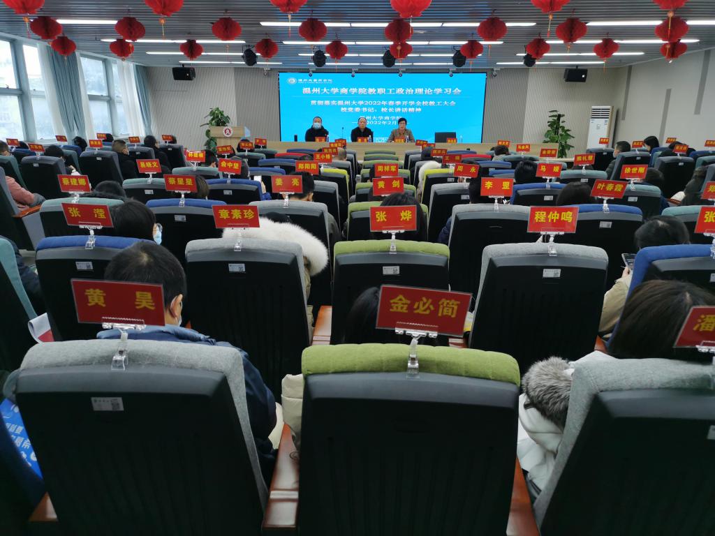 在商院楼A226仲辉商道讲堂举行2022年春季新学期教职工理论学习大会,切实提高政治站位,认真贯彻落实谢树华书记、赵敏校长在2022年春季新学期全体教职工大会上的讲话精神。全体教职工参加学习会,会议由学院党委书记郑彩莲主持。