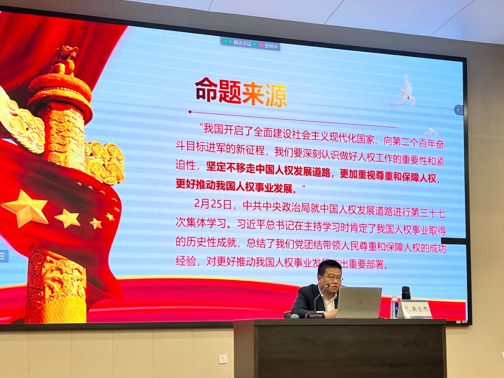 会上,袁士杰老师从三个维度展开。首先,袁老师从古代资源、文明成果和伟大综合三个角度解读了中国人权的理论基础。紧接着,袁老师介绍了中国人权道路的制度支撑。随后,袁老师以“扶贫攻坚”和“抗击疫情”为例介绍了我国人权道路的实践效果。袁老师强调,青年要担负起推动我国人权事业发展的历史责任,推动参与全球人权治理,着力于讲好中国故事,弘扬正确人权观,开展人权教育与人权研究,并对“人权”的界定、功能、思想发展以及中西方人权差异作了进一步阐释;最后,袁老师对全球人权发展和中国使命进行讲解。他指出,单一人权的文化霸权主义和异化的人权主义将导致人权文化多样性的丧失和人权的“去国家化”。中国的使命就是参与世界人权治理,捍卫人权文化多样性。
