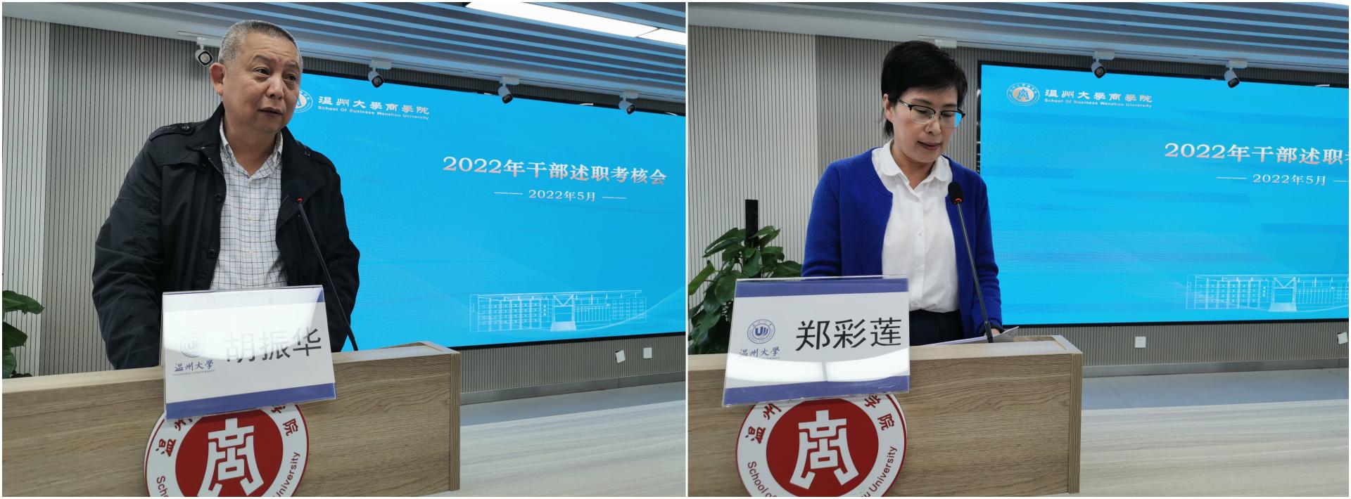 学习会前进行了2022年干部述职考核会,学院院长胡振华、党委书记郑彩莲作现场述职,学院科级以上干部考核材料已提前公示,全体教职工进行民主测评并投票。