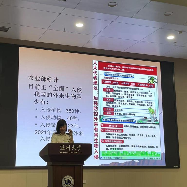 温州海关的董晓慧主任为学生们讲述了外贸中的国门生物安全,她先介绍检疫的对象包括昆虫、病菌、软体动物等,再通过一个个图文并茂的案例向同学们讲解了一些在外贸检疫中出现过的生物及其危害,其中有许多是她自己在检疫中发现的。从同学们看这些昆虫或病毒图片的反应中可以看出他们被这些不起眼的生物能够带来的危害所震撼。