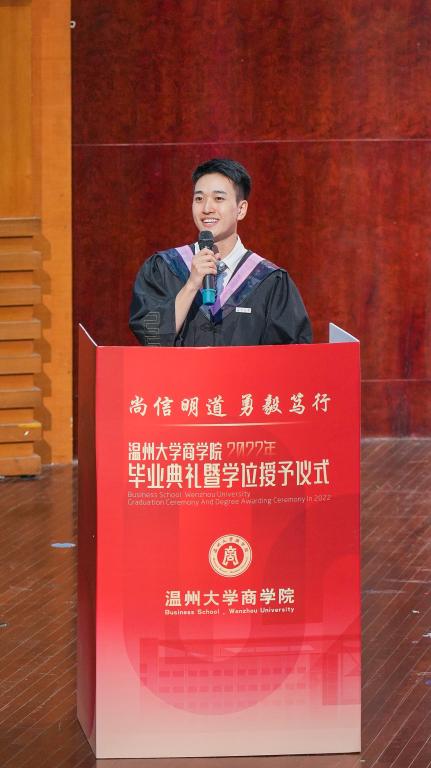 18级金融工程2班的张嘉诚同学作为毕业生代表发言,他回顾了在魔镜号
