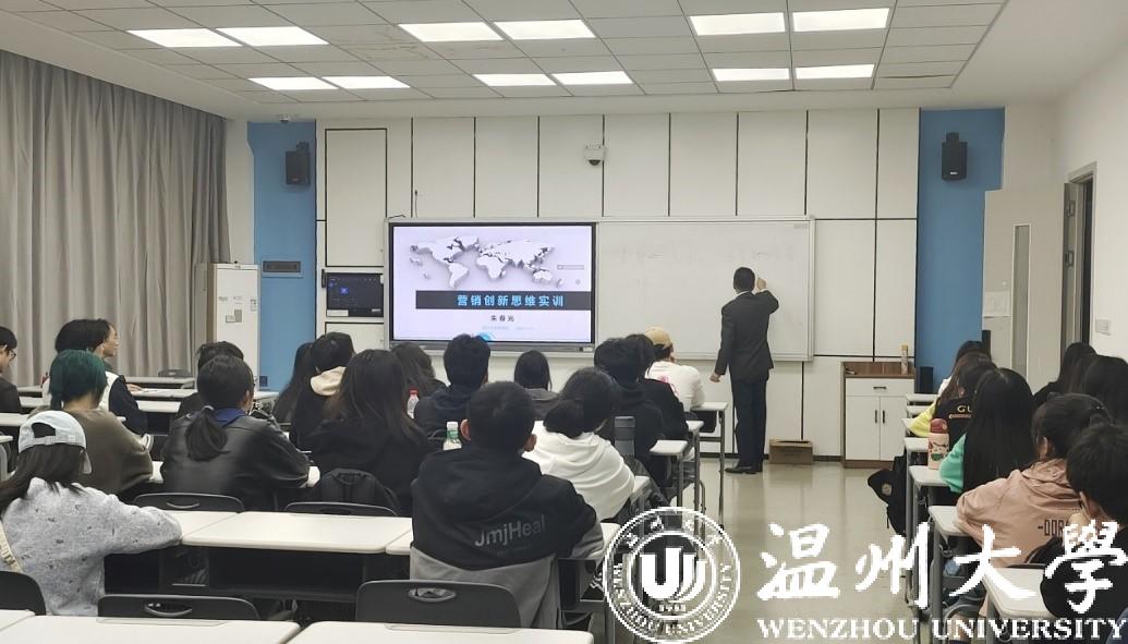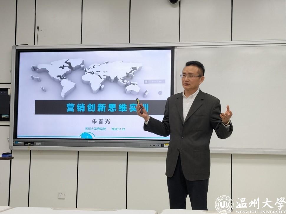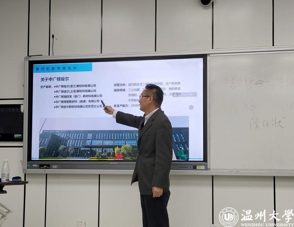 2021级工商管理本科学生于北2—109智慧教室召开动员会议,开启了本学期的营销创意思维训练教学的第一课。中广核俊尔(浙江)新材料有限公司的朱春光副总应邀莅临课堂,为同学们现身传授营销的实战经验。