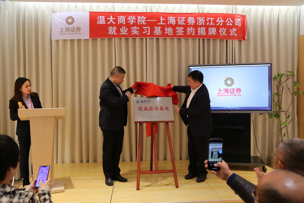 —上海证券浙江分公司就业实习基地协议书,现场由校长赵敏和上海证券浙江分公司总经理金洛川一起举行了揭牌仪式。