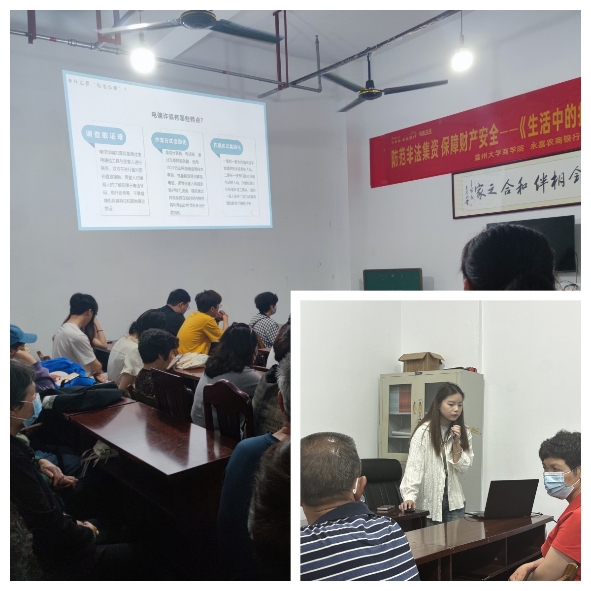 首先,《生活中的投资者教育》的老师和学生们到达永嘉县城南锦苑社区,在永嘉农商银行工作人员的带领下来到位于社区内的活动基地。学生和老师积极展开反诈宣传活动的准备工作,等候居民就位。在等候的同时,老师放映了一部根据发生在温州真实案件改编的反诈宣传影片。通过影片,让居民们知道诈骗分子会利用各类五花八门的新鲜手段,去包装粉饰他们的诈骗行为,在利用花言巧语和高收益高回报的宣传,特别容易让老年人或者家庭妇女群体上当受骗。