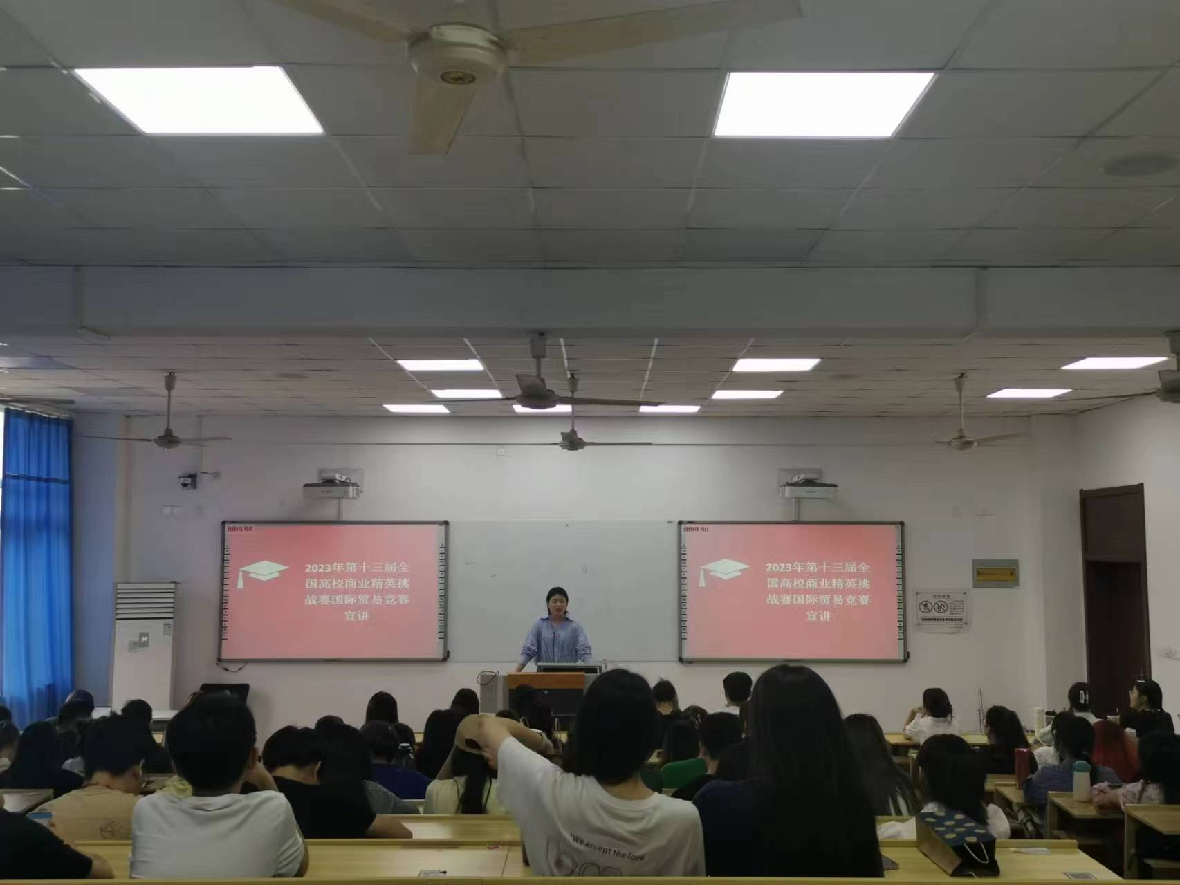 2023年6月7日,马媛老师在3-301教室给130多名国贸系学生介绍了第十三届全国高校商业精英挑战赛国际贸易竞赛比赛的规则和比赛的内容。