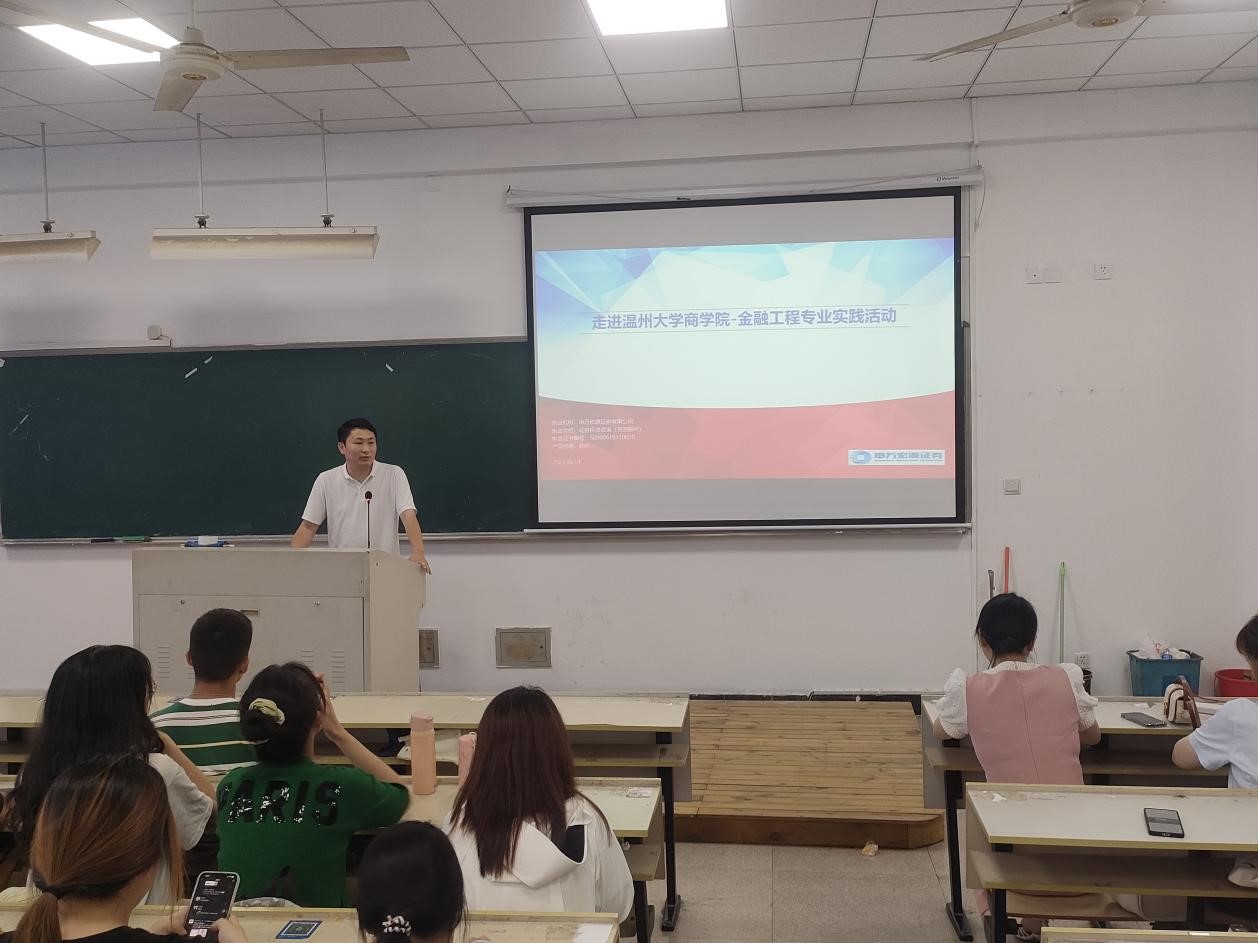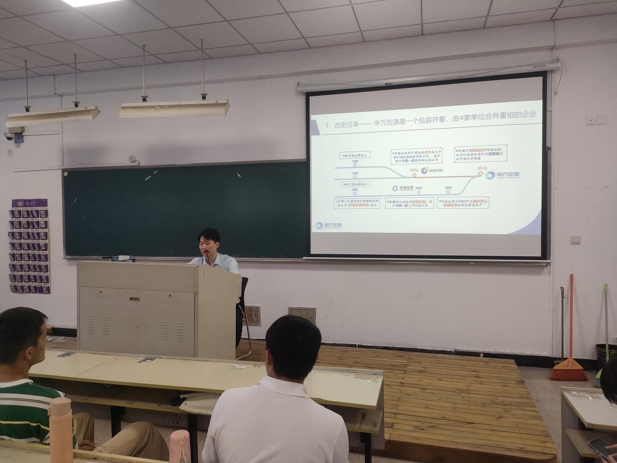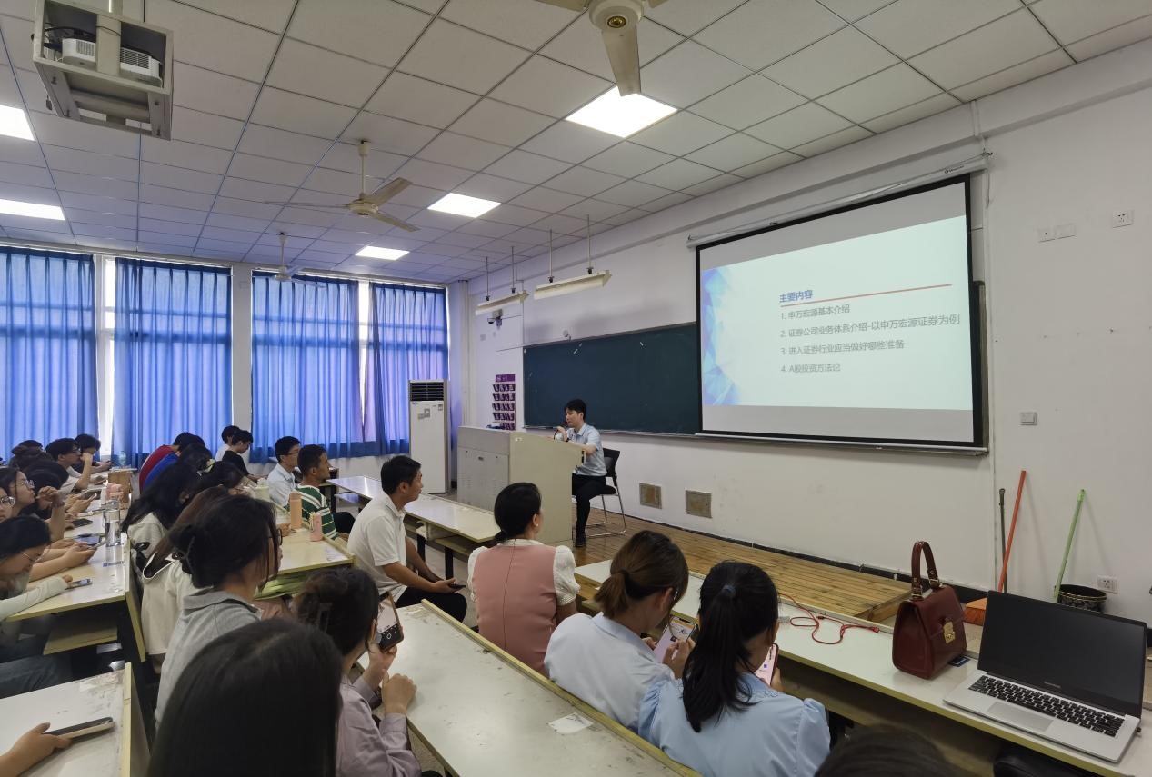 申万宏源证券温州分公司资深投资顾问陈科向同学们详细介绍证券公司业务体系和进入证券行业需要做好的准备工作。首先,陈顾问从历史沿革、人员结构、业务优势、四大业务板块等多方面基本介绍了申万宏源证券温州分公司的现状。接着,他针对企业金融、个人金融、机构服务三大板块,为同学们详细阐述了投资银行业务、创新投资业务、财富管理业务、主经纪商业务、自营业务、研究业务的具体内容,干货满满,让同学们收获颇丰。随后,陈顾问站在大学生角度,切身介绍了目前想要进入证券行业需要做好的准备工作。第一,他指明从事证券工作需要扎实的专业基础,除却经济金融类背景外,其他拥有复合专业背景如法律、理工科等的人才会被优先考虑,因此他建议同学们可以在学好自身专业的同时关注证券市场营销、法律法规等知识,丰富自己的知识体系;第二,他建议同学们可以利用大学的空闲时间考取各类金融证书,如基金从业资格考试、期货从业资格考试、初级会计师资格考试、CPA等;第三,他鼓励同学们丰富自己的实习经历,实习是一个提前接触职场的良好机会,可以培养团队协作能力、沟通能力,更好地夯实专业知识、增进自身阅历。