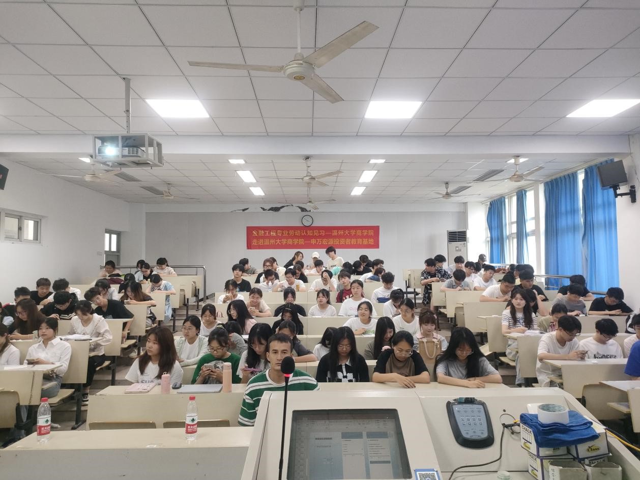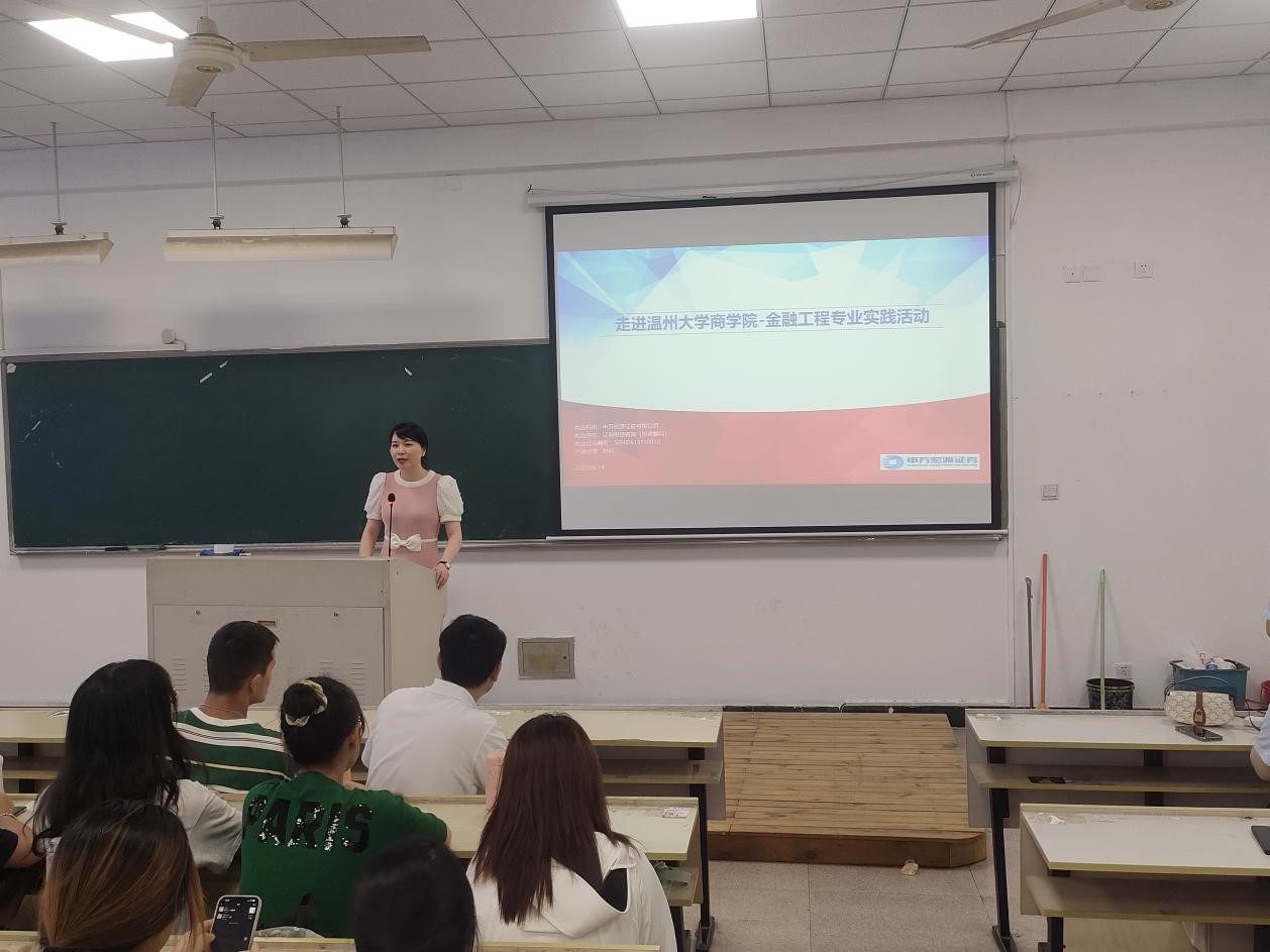 金融工程系于2023年6月14日在北3-401教室展开专业见习讲座,本次讲座特别邀请了申万宏源证券温州分公司机构金融部经理林陈娥、资深投资顾问陈科、财富管理部经理陈时察,深入交流证券行业的行业发展和了解大学生防诈与证券防诈的相关知识。