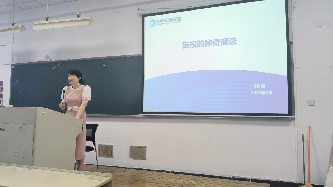 申万宏源证券温州分公司机构金融部经理林陈娥就基金定投的神奇魔法展开宣讲,详细介绍了基金定投的概念和优势,并分享了定投计划。她首先与同学们展开了话题互动,通过了解同学们的投资行为,帮助他们更好地理解基金定投。她接着详细介绍了基金定投的神奇魔法,包括降低投资成本、高位进场也能获得正收益、何时进场变得不那么困难等方面。对于第一次接触基金定投的同学们,林经理还介绍了定投中断的三大原因:出于亏损状态、绝对收益低、相对收益低,并在此基础上以进入时点、止盈时点、扣款频率、扣款金额、优选基金为五要素打造了一套定投计划,让同学们全面深入地学习到基金定投的操作流程。最后,她还表示申万宏源证券群里会不定期分享一些优质基金,同学们有任何困难或疑惑都可以咨询申万宏源证券的经理们。林经理的分享不仅提高了同学们的理财意识,也让他们更加了解到证券行业的服务和资源优势。