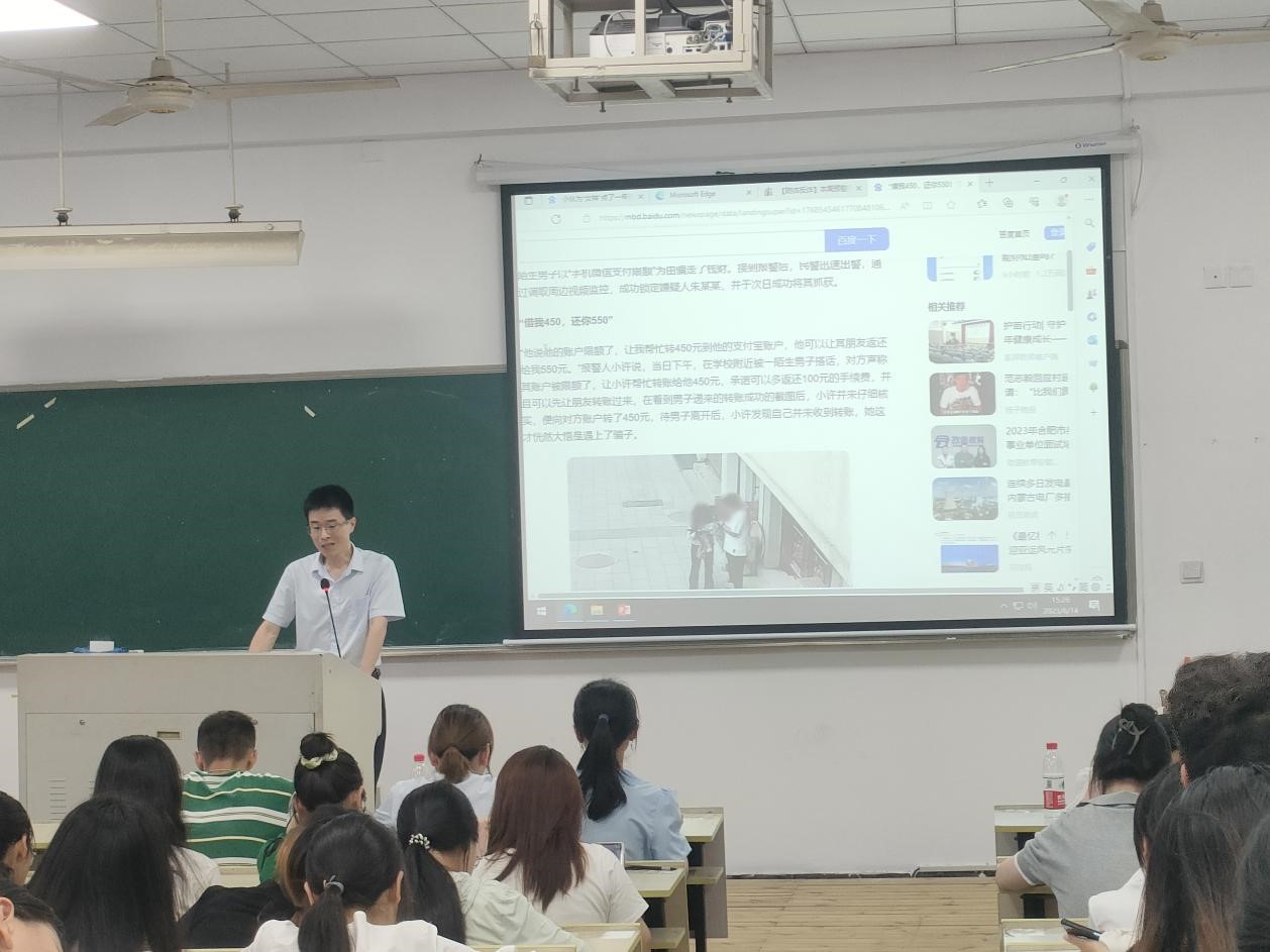 申万宏源证券温州分公司财富管理部经理陈时察就大学生防诈与证券防诈为主题展开宣讲。首先,他指出为了更好地规避诈骗行为,了解诈骗对象和诈骗行为的特点是第一步。在当今的大学校园,大学生上当受骗的案例时有发生,究其源头受骗的大学生有着共同特点:人生经历少、粗心大意、贪小便宜、急功近利;诈骗三大特点:自由组合诈骗和定制诈骗相互交织,作案形式多样、诈骗手段持续更新,作案组织缜密、团队内部分工日益精细;以上种种特征都表明现在的诈骗形式层出不穷,陈经理强调同学们要时刻保持冷静的头脑,不要被一时的蝇头小利蒙蔽眼睛。然后,他利用近期现实案例向同学们详实地介绍了诈骗类型的多种多样,常见的有网上刷单诈骗、冒充客服/工作人员诈骗、网络游戏诈骗、冒充好友诈骗、以假手机/赃物手机销售方式进行诈骗、以兼职为名设置骗局,更有甚至利用AI换脸和声音合成的手段进行新型诈骗,进一步警示同学们诈骗手段的五花八门和防不甚防。对此,他建议同学们在日常中要时刻保持警醒,防诈意识挂心头,不感情用事,不贪小便宜,谨慎交友!