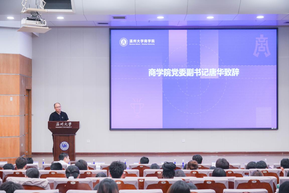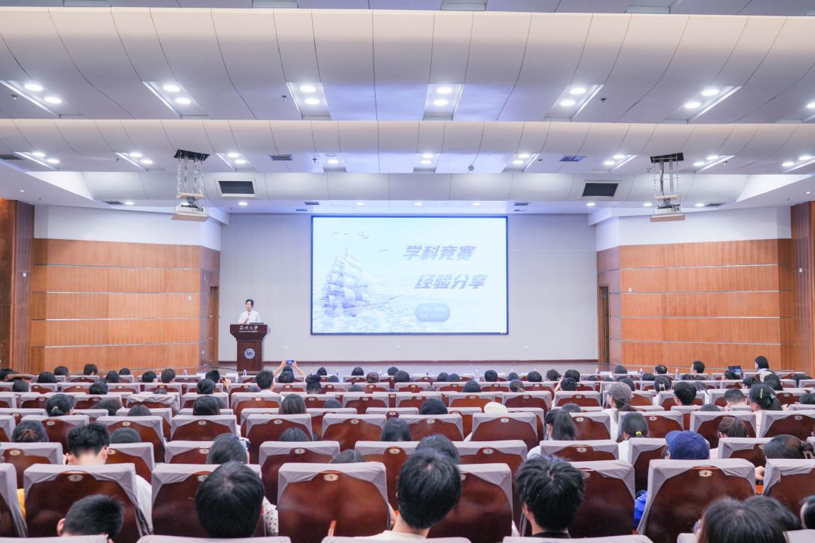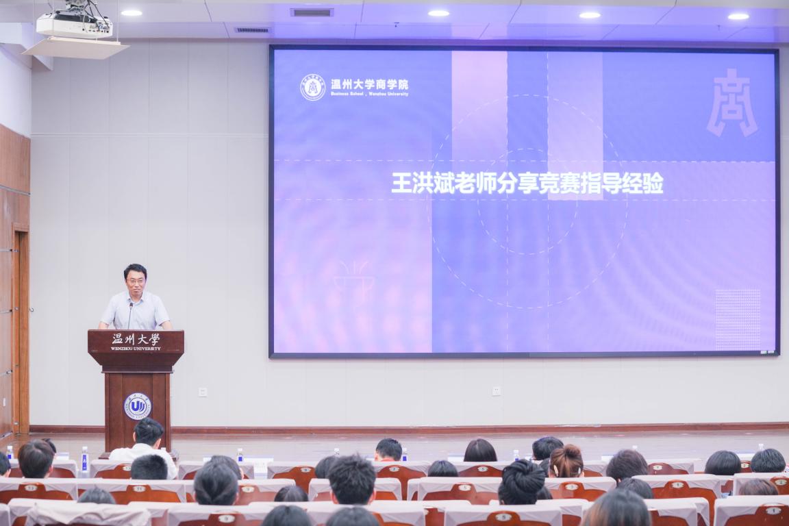 仪式上,“挑战杯”创业计划赛国赛铜奖指导老师王洪斌为师生们带来了竞赛指导经验的专题分享,从项目、学生、指导老师三个角度作了简要阐述。他提出,好的项目一定能解决社会痛点,要从学术出发并为解决社会问题而产生;而在学生团队中,则需要形成一股合力,拥有一个好的领导者十分重要。除此之外,学生要积极参加各项学科竞赛,提升自己的专业素养;作为指导老师,需要提前去了解熟悉各种竞赛的赛制,才能为学生做出最有效的指导,积极帮助同学们更好地参加各项学科竞赛。