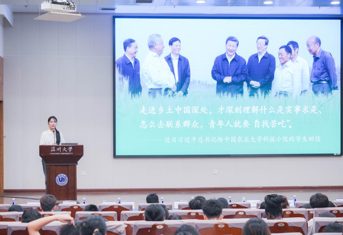 随后,22财务2班的潘宝仪同学作为浙江省“挑战杯”学术科技作品竞赛的参赛项目的主答辩手,向大一同学分享了赛事了解、前期准备、打磨作品的过程以及比赛成果等角度的经验,并向全体同学提出建议:积极去获取比赛的经验成果,享受拼搏的乐趣,谱写属于我们的大学篇章。21金融工程1班的蔡雨欣同学向大家展示了他们团队的浙江省第十八届“挑战杯”大学生课外学术科技作品竞赛参赛项目——《农业数字化转型赋能乡村振兴的实现路径及经验启示——以80家示范性家庭农场为例》。她从项目的研究背景、现状分析、扎根分析、路径选择、经验及启示和未来展望等多个方面向在座的全体师生进行路演展示。