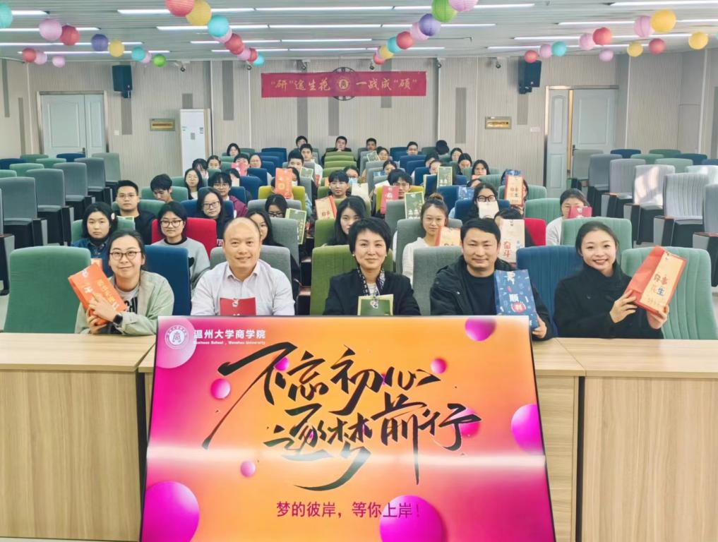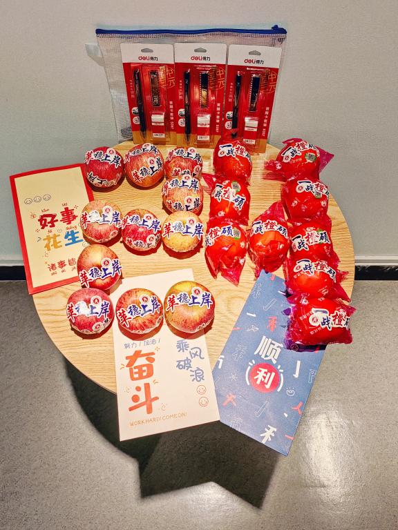 开展2024届考研慰问活动,学院党委书记李密、学院党委副书记唐华、学生科辅导员周洁文、张元祝、胡施施老师以及24届考研学子出席本次活动。学院还精心为考生们准备“考研加油包”,为他们加油助力。“考研加油包”包含了考试必备的文件袋、涂卡笔、橡皮、黑色中性笔等文具用品,还有贴着有祝福意义贴纸的苹果和黄橙,寓指着考研学子们能够心想“苹”稳上岸、心想事“橙”,希望考研学子们能够在考研大军中脱颖而出,一战成“硕”。