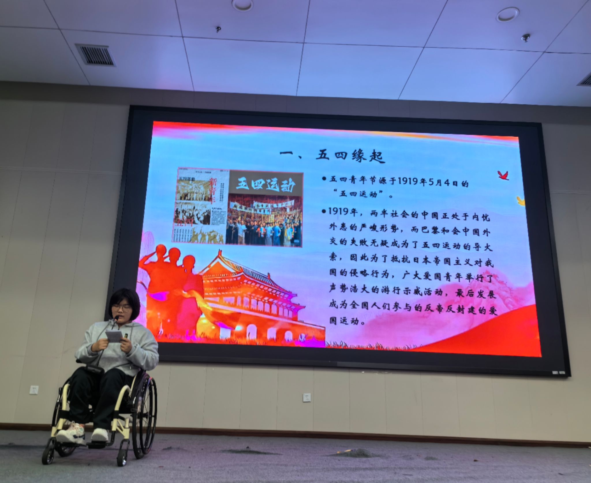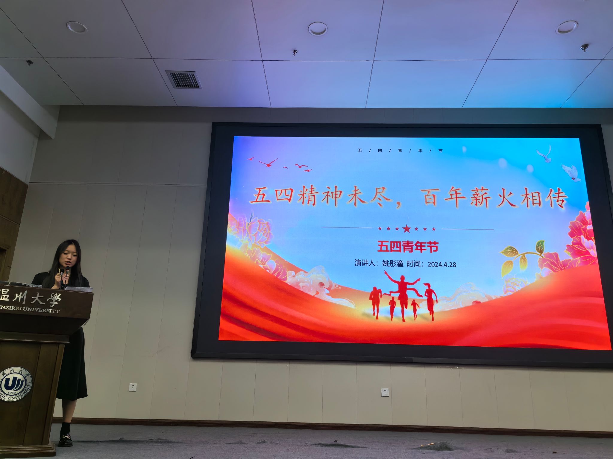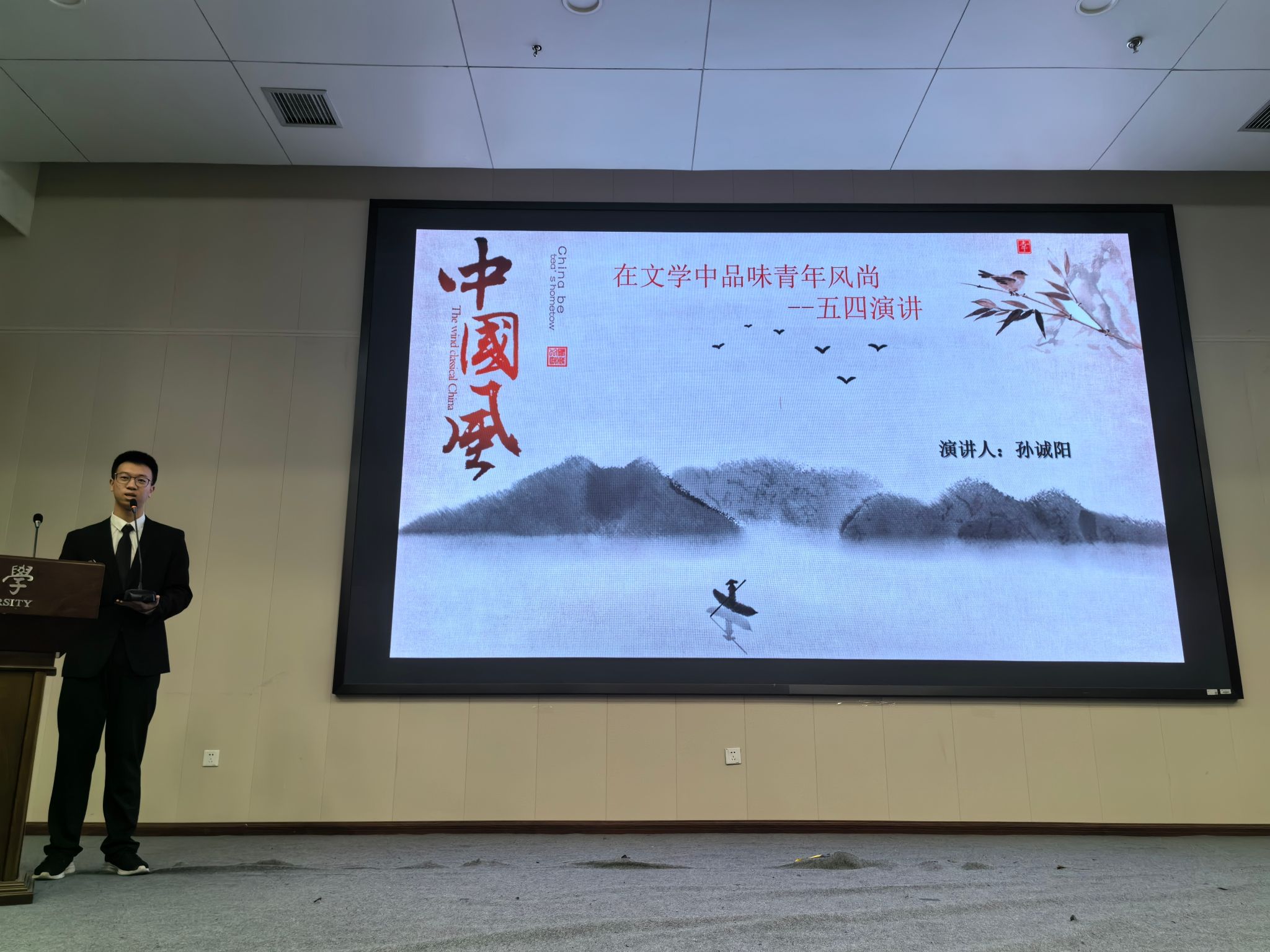 合唱比赛后,11位23级同学逐一上台进行主题演讲。每一位同学或结合自身经历,或着眼社会热点,讲述了自己对五四精神的理解,对青年使命的领悟,向在场观众展现了当代青年的朝气,表达了时代新人的责任与担当。
