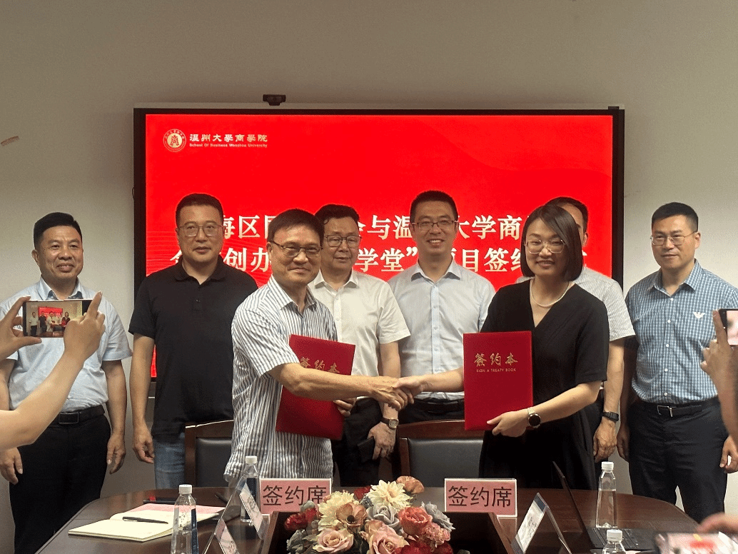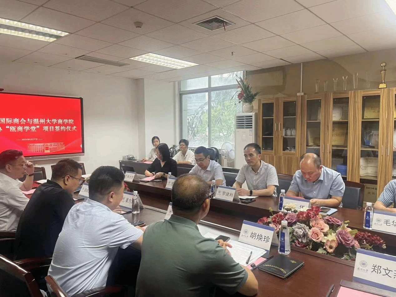 与瓯海区国际商会校地合作创办“瓯商学堂”项目正式签约。瓯海区商务局党组成员、副局长姜方泽,政府驻派“党委委员”林建炜、瓯海国际商会会长郑祥政、执行会长何显龙、秘书长诸绍奇、办公室主任胡焕珍、副秘书长郑文燕、法务部副部長管晓慧,魔镜号