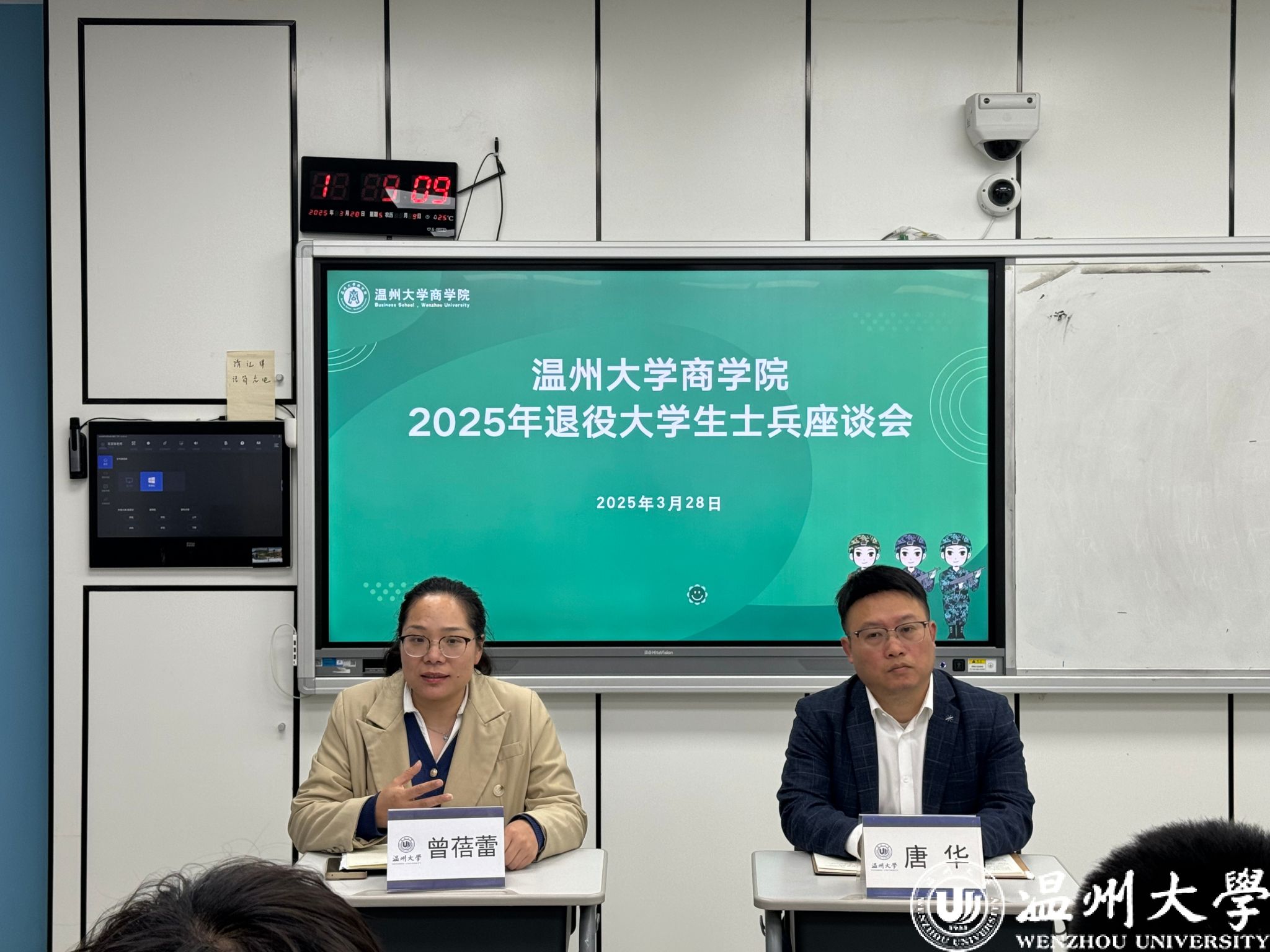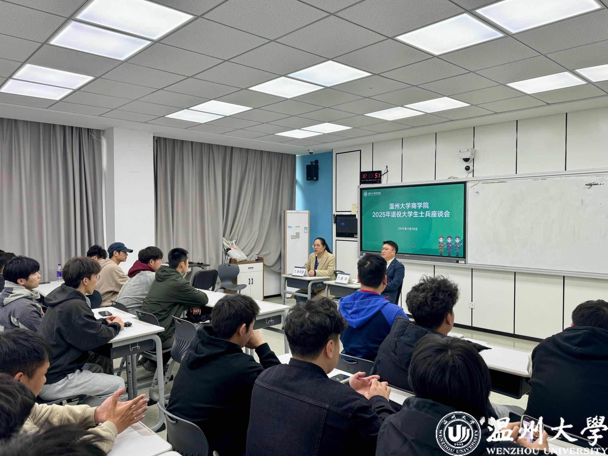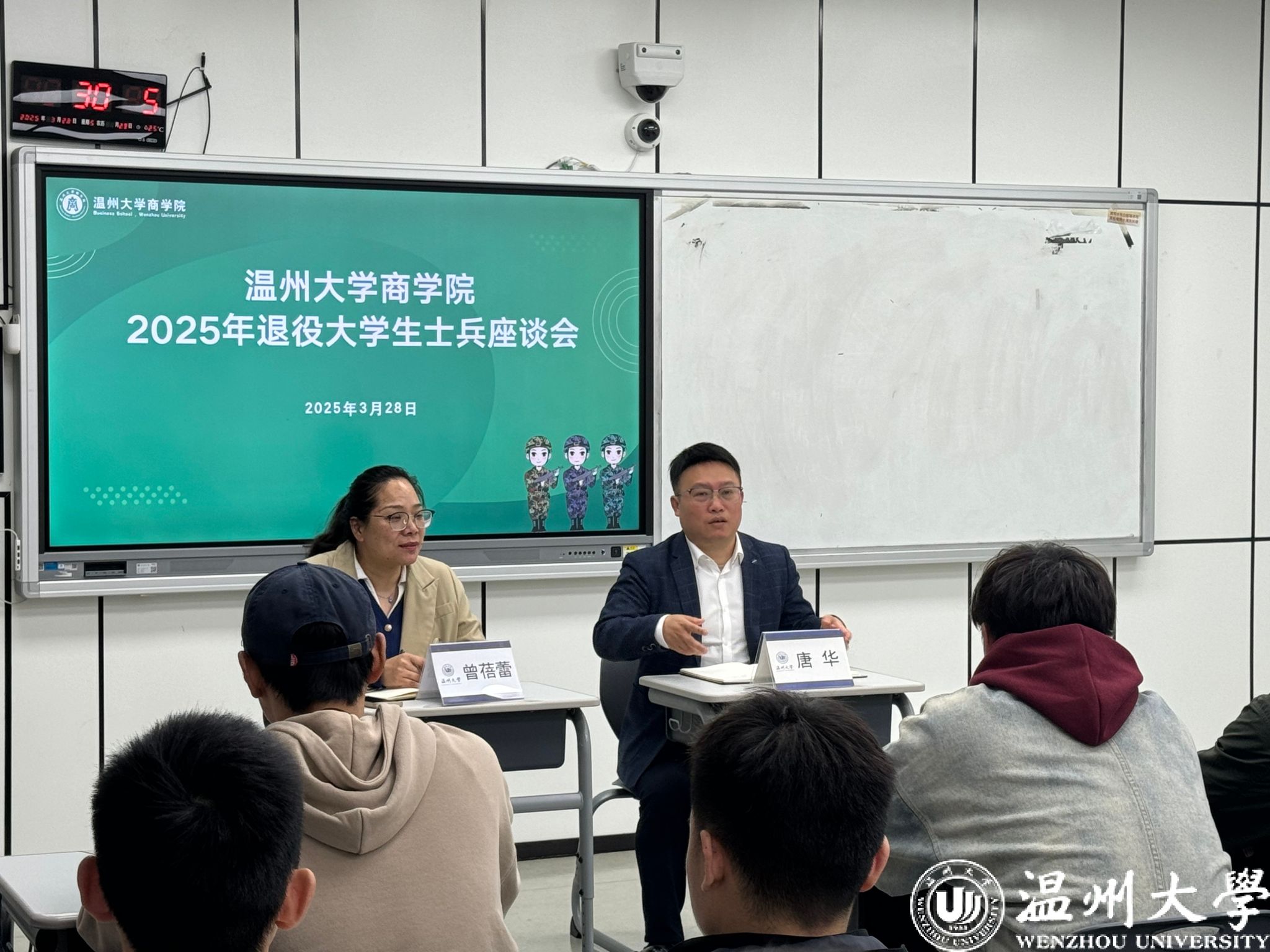 于3月28日召开2024-2025学年第二学期退役大学生士兵座谈会。会议由学院党委副书记曾蓓蕾主持,学院党委书记唐华、退役大学生士兵代表等共同参与。