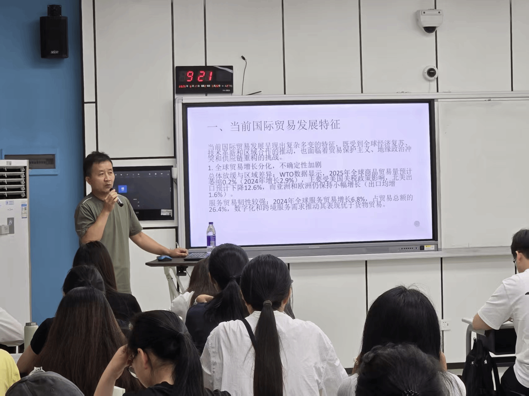 讲座伊始,钟主任聚焦当前国际贸易发展特征展开分享。结合WTO最新数据,他剖析全球贸易格局:2025年全球商品贸易量预计萎缩0.2%,区域分化显著——北美出口受美国关税政策冲击预计下滑12.6% ,而亚洲、欧洲仍维持1.6%左右的小幅增长;同时,服务贸易展现强韧性,2024年以6.8%的增速、占贸易总额26.4%的占比,凭借数字化与跨境服务需求,成为贸易增长新引擎。钟主任以详实数据与案例,带同学们穿透“复杂多变”的表象,理解全球经济复苏、技术革新与地缘政治博弈下,国际贸易的机遇与挑战。