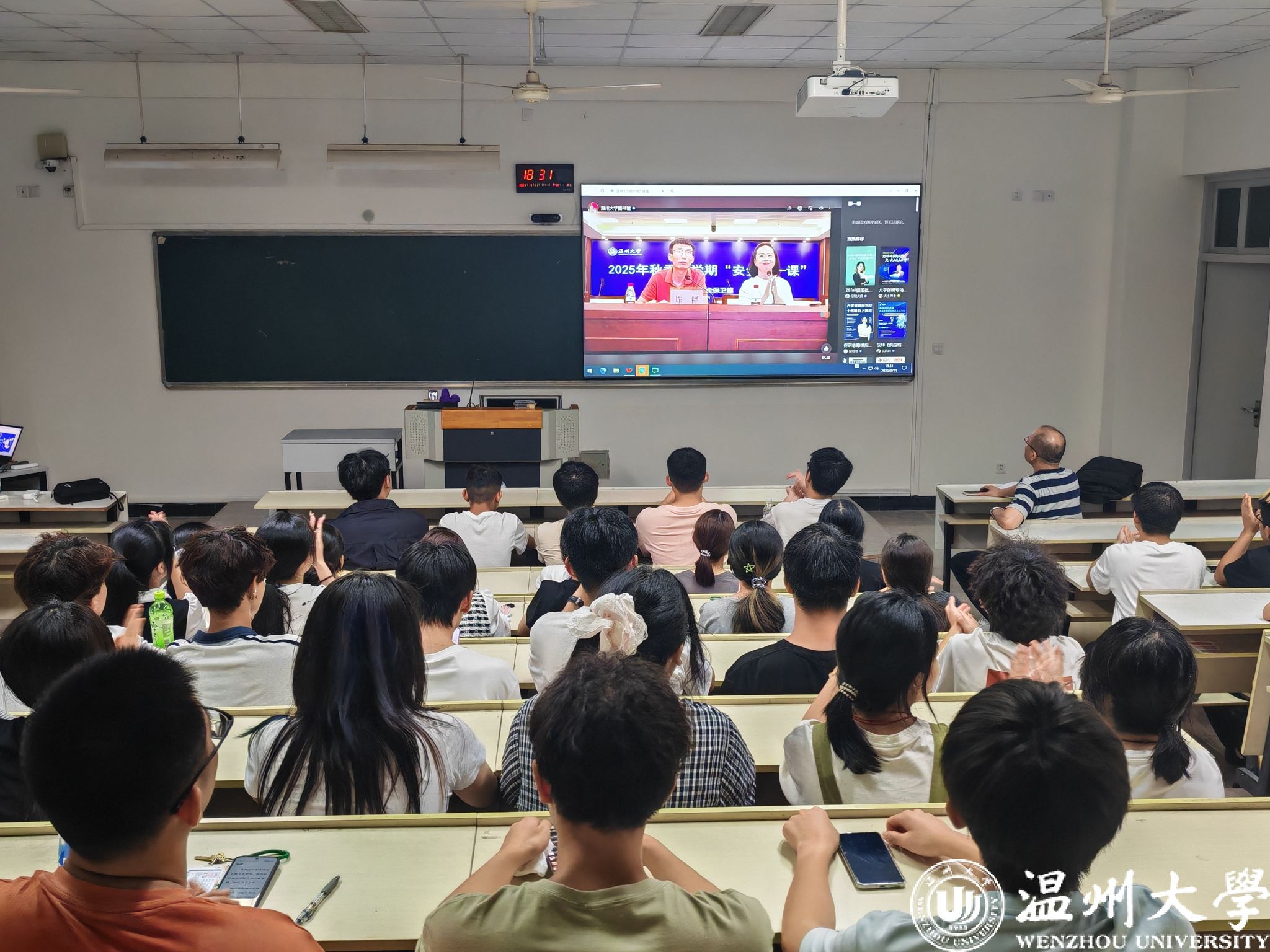 精心组织465名新生集中线下观看,此次云课堂由安全保卫部副部长陈铎主讲,政保科科长陈琪主持。