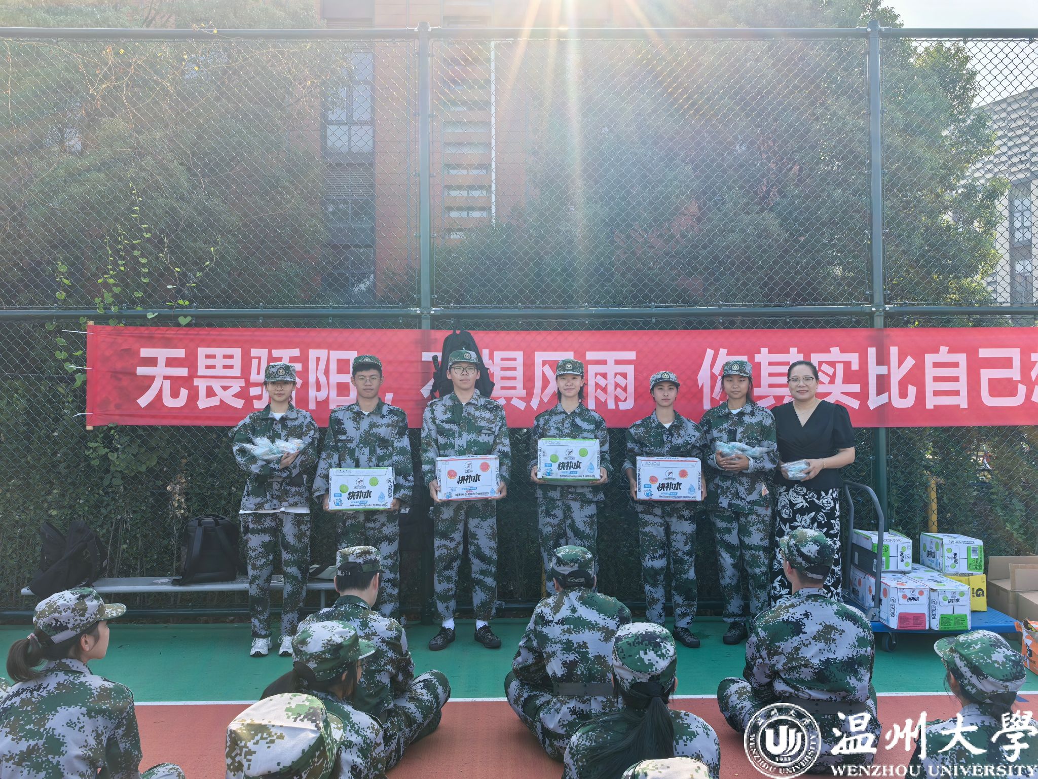 曾蓓蕾副书记走进队伍中,与同学们亲切交流。她代表学院向全体参训学生表示诚挚问候,并指出,军训是大学生成长的重要一课,不仅锻炼体魄、磨练毅力,更是培养纪律意识和集体荣誉感的宝贵经历。她鼓励同学们珍惜训练机会,将军训中形成的坚韧品质和协作精神延续到今后的学习生活中,为大学生涯开好头、起好步。她还对教官们的严格施训和辛勤付出表示衷心感谢。随后,各位老师为同学们和教官送上了功能饮料和冰冰贴,叮嘱大家科学防暑、合理补水,以更好的状态完成训练。