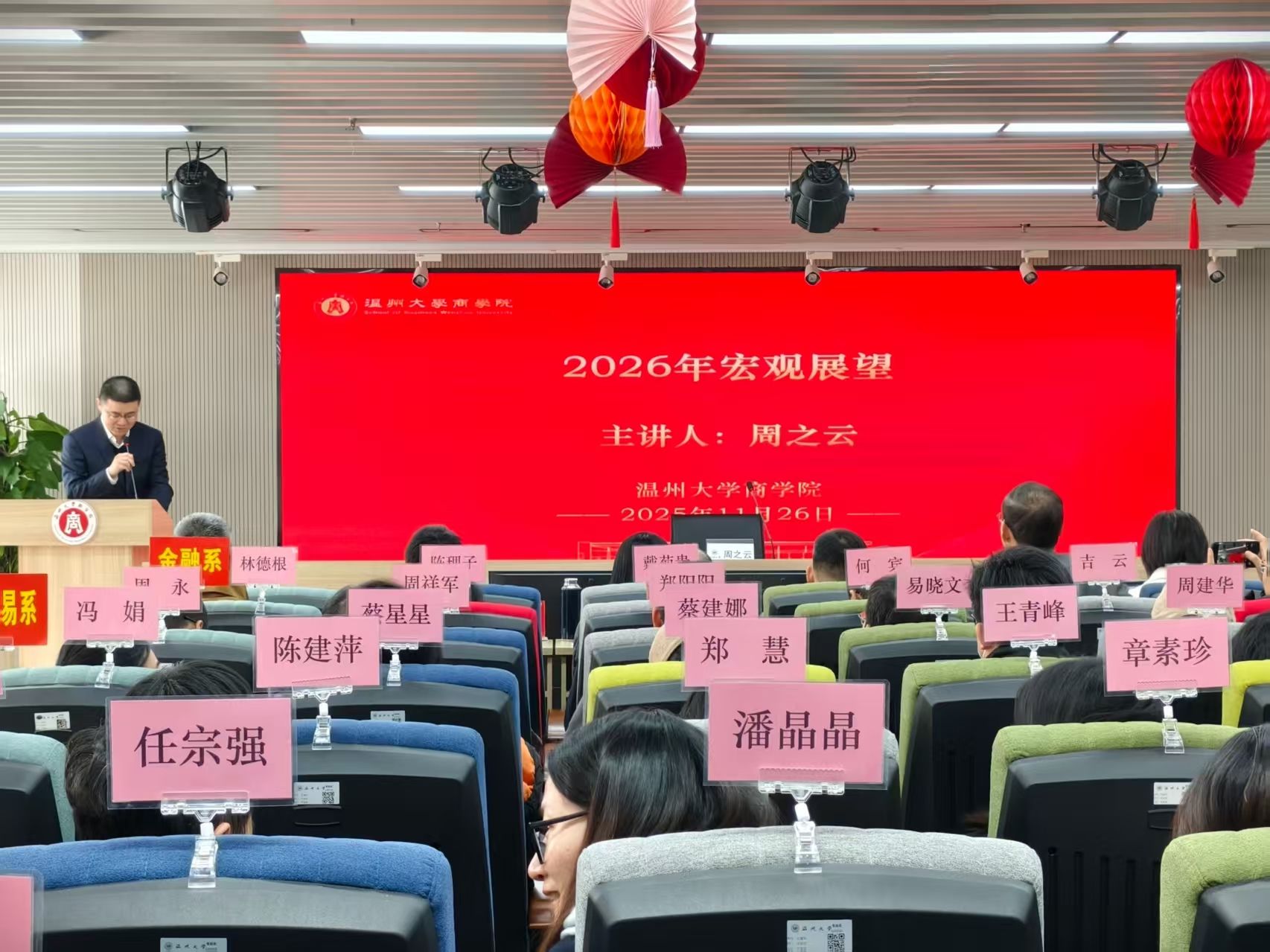 随后,会议进入专题学习环节。学院邀请物产中大期货研究院宏观组组长周之云作《2026年宏观市场展望》讲座。周之云结合党的二十届四中全会关于“进一步全面深化改革、推进中国式现代化”的战略部署,聚焦“十五五”规划前期研究释放的政策信号,系统分析了2026年宏观经济的结构性特征。他指出,“十五五”时期将是中国经济从规模扩张转向质量优先的关键阶段,核心关键词是“自立自强”——科技将成为第一驱动力,传统产业加速向智能化、绿色化、融合化转型。他特别强调,“十五五”规划将聚焦提升居民消费率、建设现代化产业体系等重大任务,相关改革方向将为高校科研布局和人才培养提供新机遇。