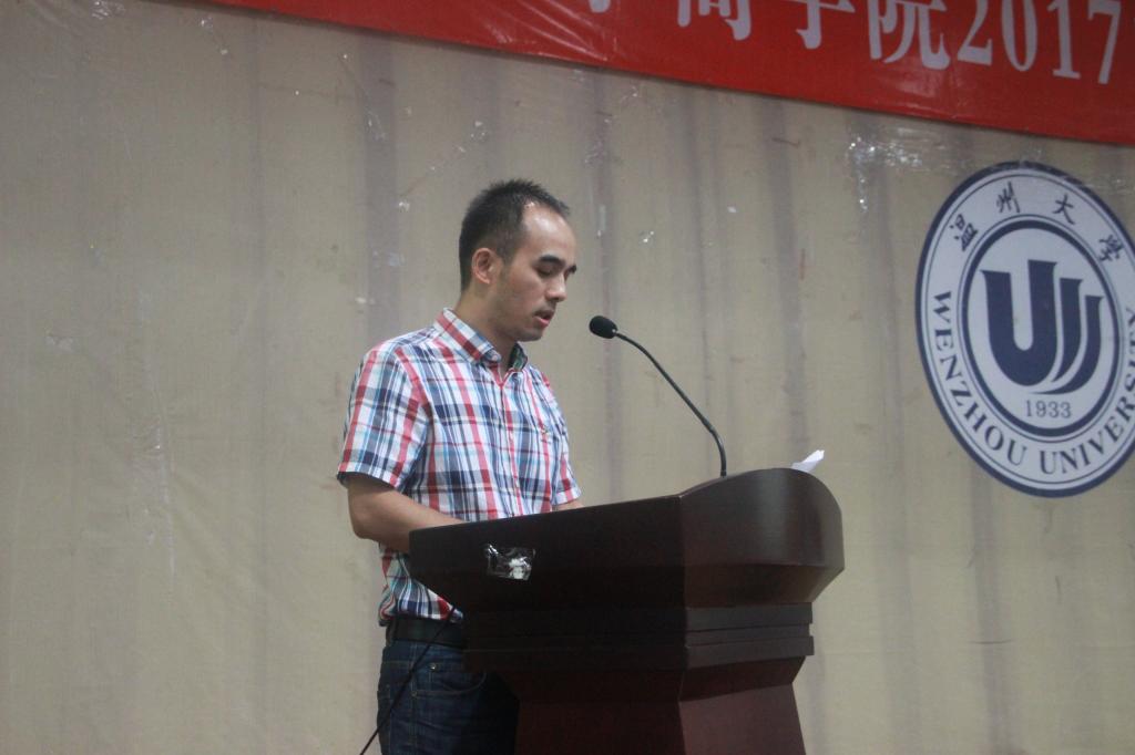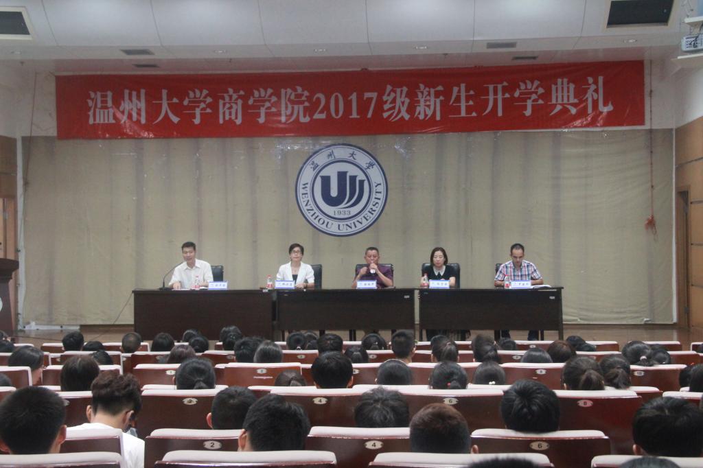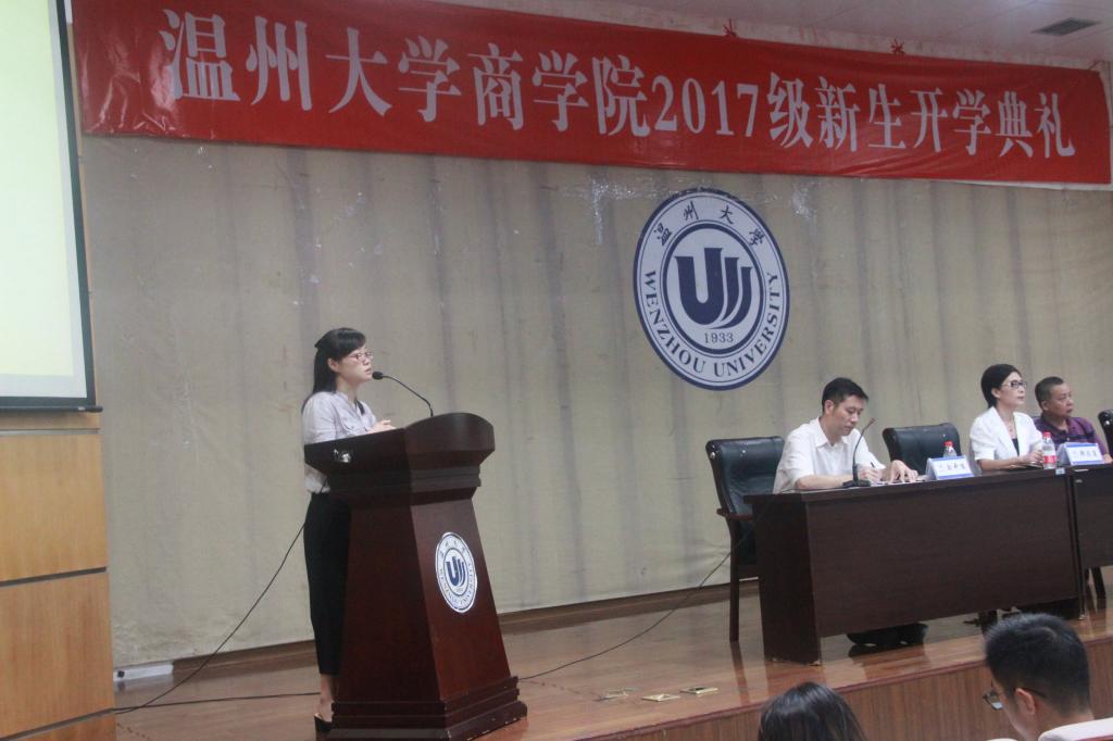 2017级新生开学典礼的帷幕。郑彩莲书记在致辞中代表学院向17级新生的到来表示衷心的祝贺和诚挚的欢迎。郑书记围绕“概率与你”的主题,向新生提出“提高大学期间成才的概率、提高大学期间善于交往的概率、提高大学期间强身健体的概率、提高大学期间自我保护的概率”四方面的期望。她以17届优秀毕业生13金融工程班的朱圆缘同学为例,鼓励新生多与牛人交往,她认为交往是一种能力,善于交往更是一种智慧,要在交往中提升自己的格局;郑书记还以魔镜号