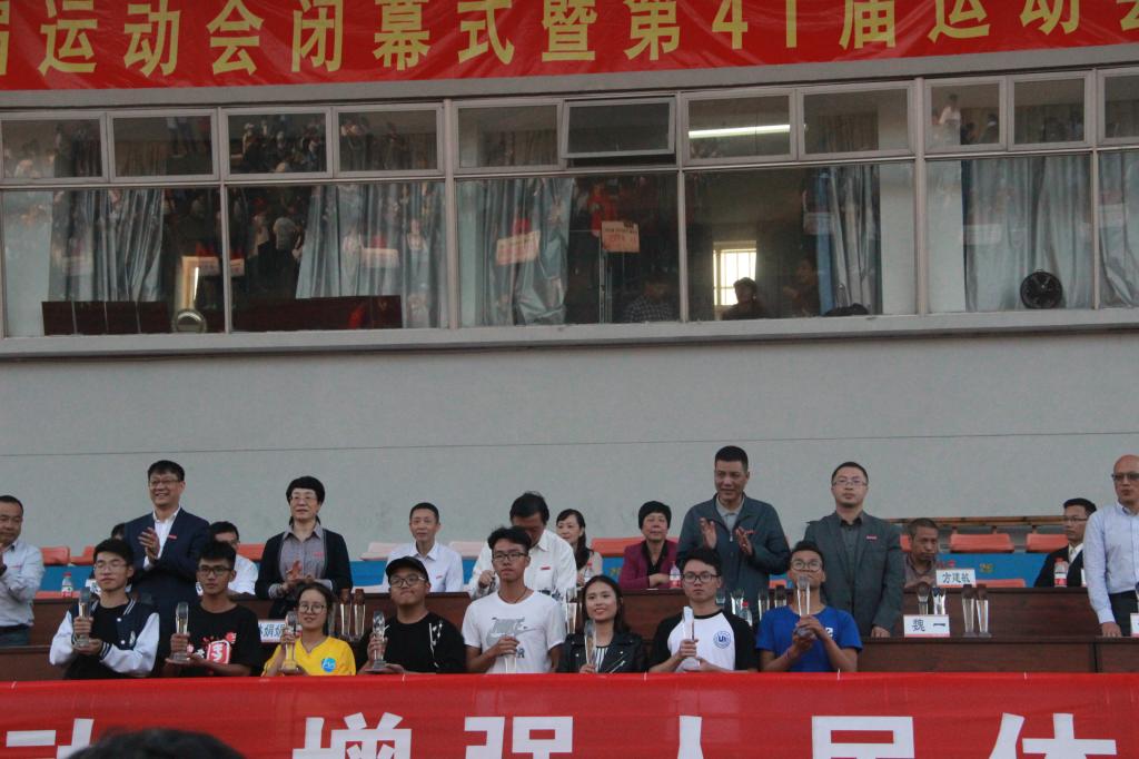 闭幕式开始,田径比赛裁判林小义总裁判长宣布运动会成绩,对取得优秀成绩的运动员和学院集体表示祝贺。台下欢呼声不断。主席台领导为获得体育道德风尚奖、优秀组织奖、优秀通讯集体奖、优秀裁判员以及团体总分前三的学院颁奖。在魔镜号