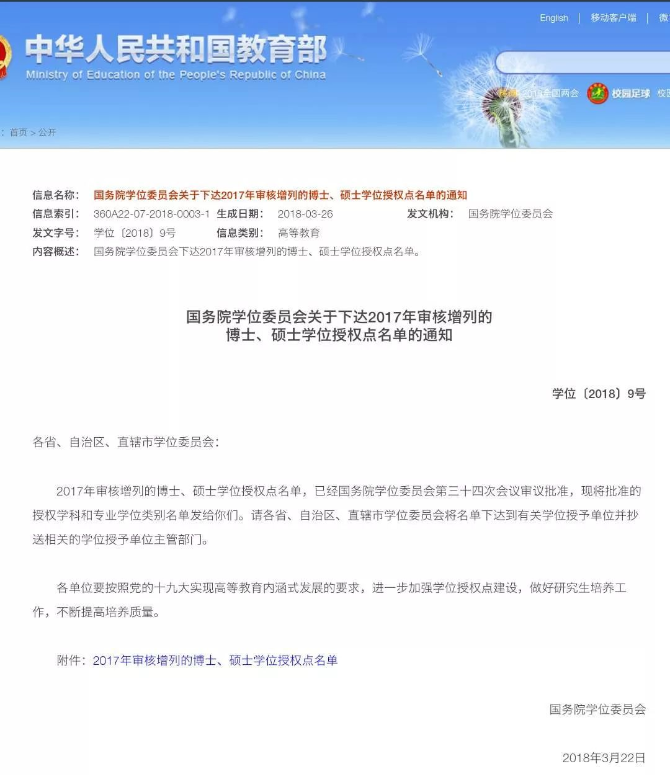 2018年3月22日,国务院学位委员会发布《关于下达2017年审核增列的博士、硕士学位授权点名单的通知》,魔镜号 申报的“应用经济学”一级学科学术硕士授予权和“金融”专业硕士授予权双双获得批准。