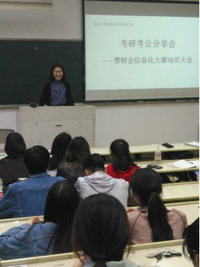 由财会系党支部牵头、张敏老师和陈建萍老师组织、温大会计协会协助落实的“考研考公分享会暨2019年财会信息化竞赛启动大会”于2019年5月8号在北校区3-401如期举行。本次会议酝酿了一个多月,邀请了来自2015级财管的候晨瑶、陈晓莎等5位考研考公的学生代表。候晨瑶同学以笔试第一和复试第一的成绩考进了浙江财经大学会计学学硕,单佳男同学以复试第一综合第八的成绩考入了浙江财经大学会计学专硕,韩海燕以前10的成绩考进了浙江工商大学会计学学硕,陈晓莎和鉏楷文以第二名的成绩分别考入绍兴国税和嘉兴国税。他们分别从考研的院校选择、时间进度安排、书籍课件选择、专业课程的准备、考公的准备等方面给学弟学妹们做了有关非常详细的分享与经验交流。张敏老师从决心、信心和恒心来鼓励大家,从学习氛围、如何备考和坚持以及专业课程设计来引导大家交流。最后陈建萍老师就今年的财会信息化竞赛做了简要的动员。本次活动是一次答疑解惑的思想交流,是一次优良学风的传承,更是一次支部建设融入学科专业建设的体现。