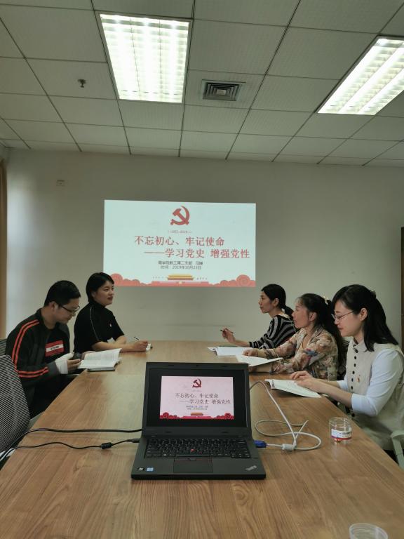 教工第二支部(国贸支部)在308会议室开展了“不忘初心、牢记使命”第五周主题教育学习活动。习近平总书记强调:“要认真学习党史、国史,知史爱党,知史爱国”。因此,国贸支部组织了党史的学习,党员马媛老师给支部党员们上了一次党课——《学习党史 增强党性》。