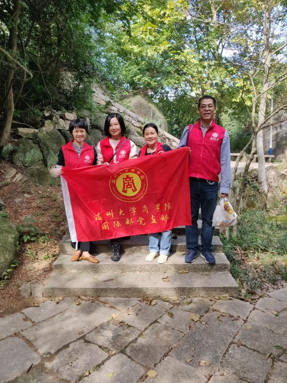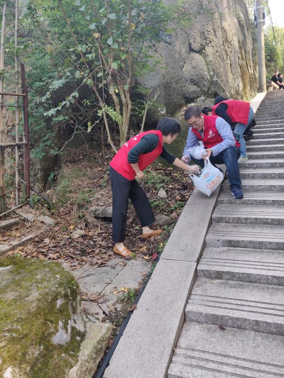 支部全体党员同志自行驱车前往大罗山五美景园。上山步道的分支处行人较少,道路两边积存的垃圾较多。党员志愿者或用双手或用树枝,将挂在树枝上的塑料袋、散落在草丛间的易拉罐瓶、以及隐藏在目不可及之处的纸巾、零食包装袋一一清除,装到随身携带的塑料袋中,大家干劲十足。经过一个多小时的努力,步道变得清清爽爽。