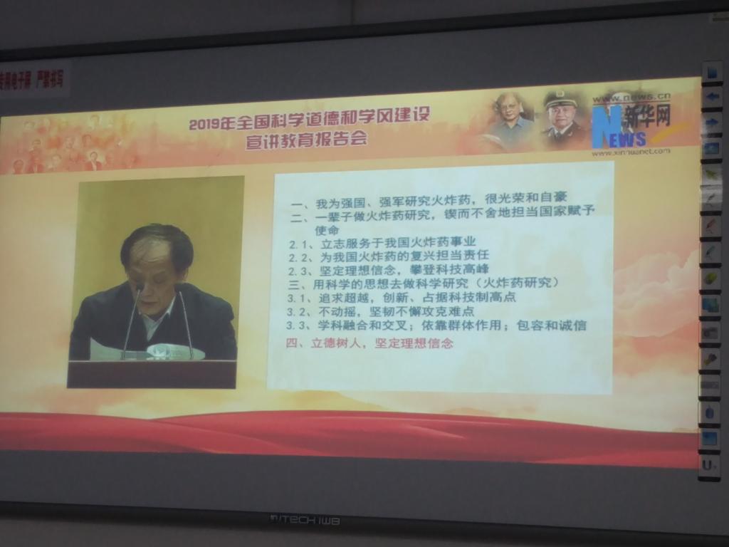 报告会中,中国工程院院士王泽山、中国工程院院士防护工程学家钱七虎、中国工程院院士南开大学校长曹雪涛三位院士简述了自己人生感悟,立志为国服务,指明科学道德和学风建设的重要性。