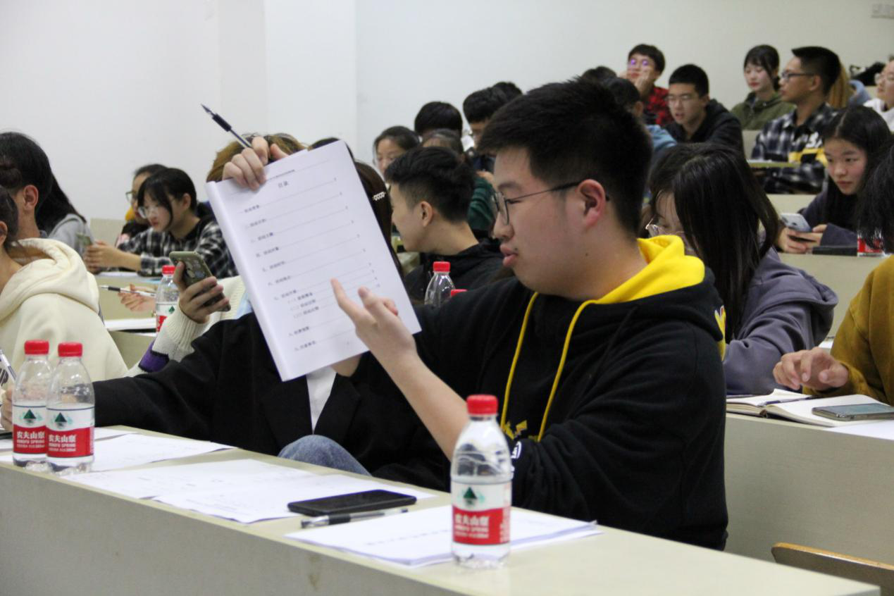 首先进行各组策划成果展示。负责演讲的同学借助ppt讲解策划案,讲解结束后,小组成员上讲台接受各位部长的提问并作出回答。在第四组展示完毕后,商院十佳歌手毛畅翔同学与吴震涛同学分别带来歌曲,活跃现场气氛。紧接着第五至第八组成员上台进行展示并进行答辩。最终第八组、第四组和第一组分别获得本次策划赛的一等奖、二等奖和三等奖,武瑞杰部长与余晨露副部长为其颁奖。