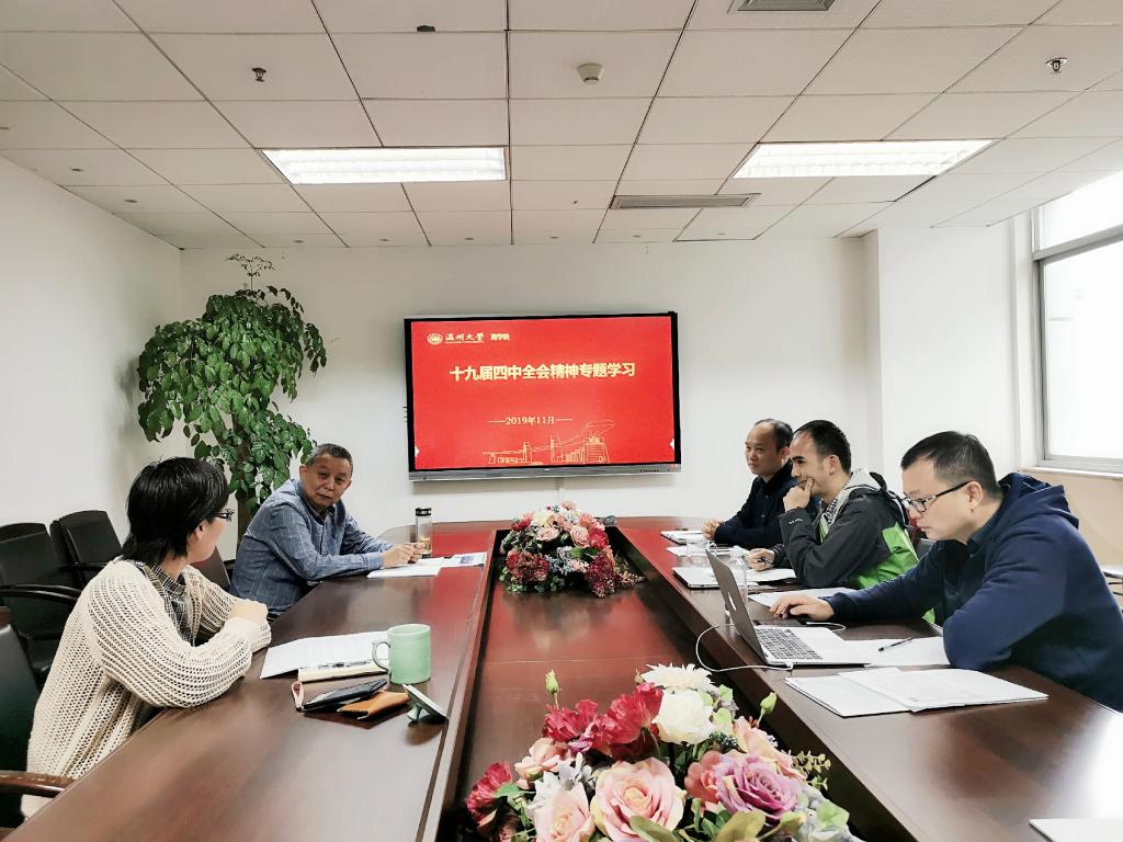 班子成员召开专题学习会,传达学习十九届四中全会精神。在前期自学的基础上,班子成员就全会公报和《中共中央关于坚持和完善中国特色社会主义制度推进国家治理体系和治理能力现代化若干重大问题的决定》分别谈了学习感想与体会。