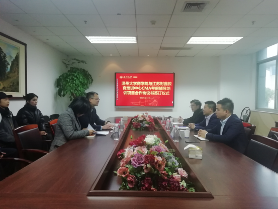 A222会议室举行了CMA等培训项目签约仪式。副院长余向前,财务管理系教师张烨,财鑫董事长张福德、财鑫浙江渠道总监桑智明、财鑫行政部部长黄健等出席此次签约仪式。