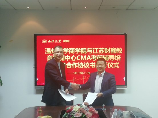 副院长余向前与财鑫教育董事长张福德签署并交换了合作协议。
