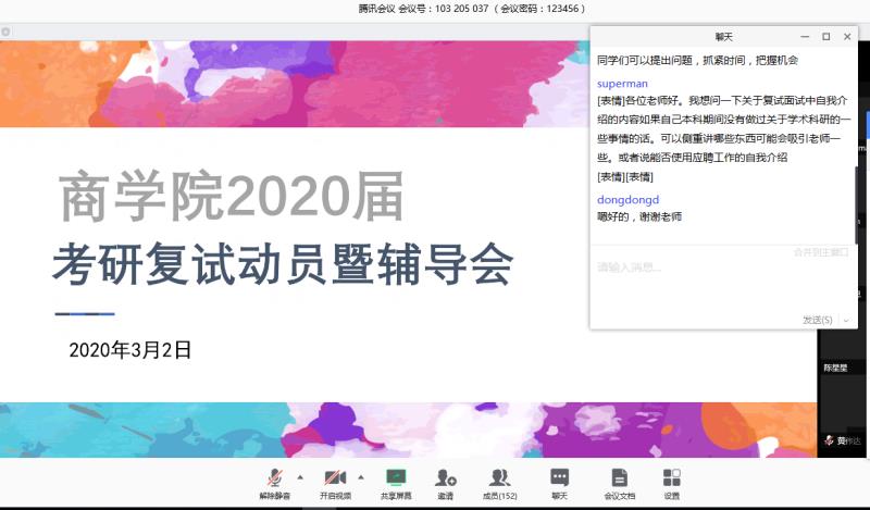 2020届考研复试动员暨辅导会在腾讯会议上正式开讲。院长胡振华,党委书记郑彩莲,副院长罗建利,副院长余向前,金融系系主任吉云,国贸系系主任马媛,财管系系主任张烨,市销系系主任张启明,国教部主任徐正及各毕业班班主任,全体辅导员,全体2020届考生和部分准备考研的同学参加此次大会。会议由党委副书记唐华老师主持。