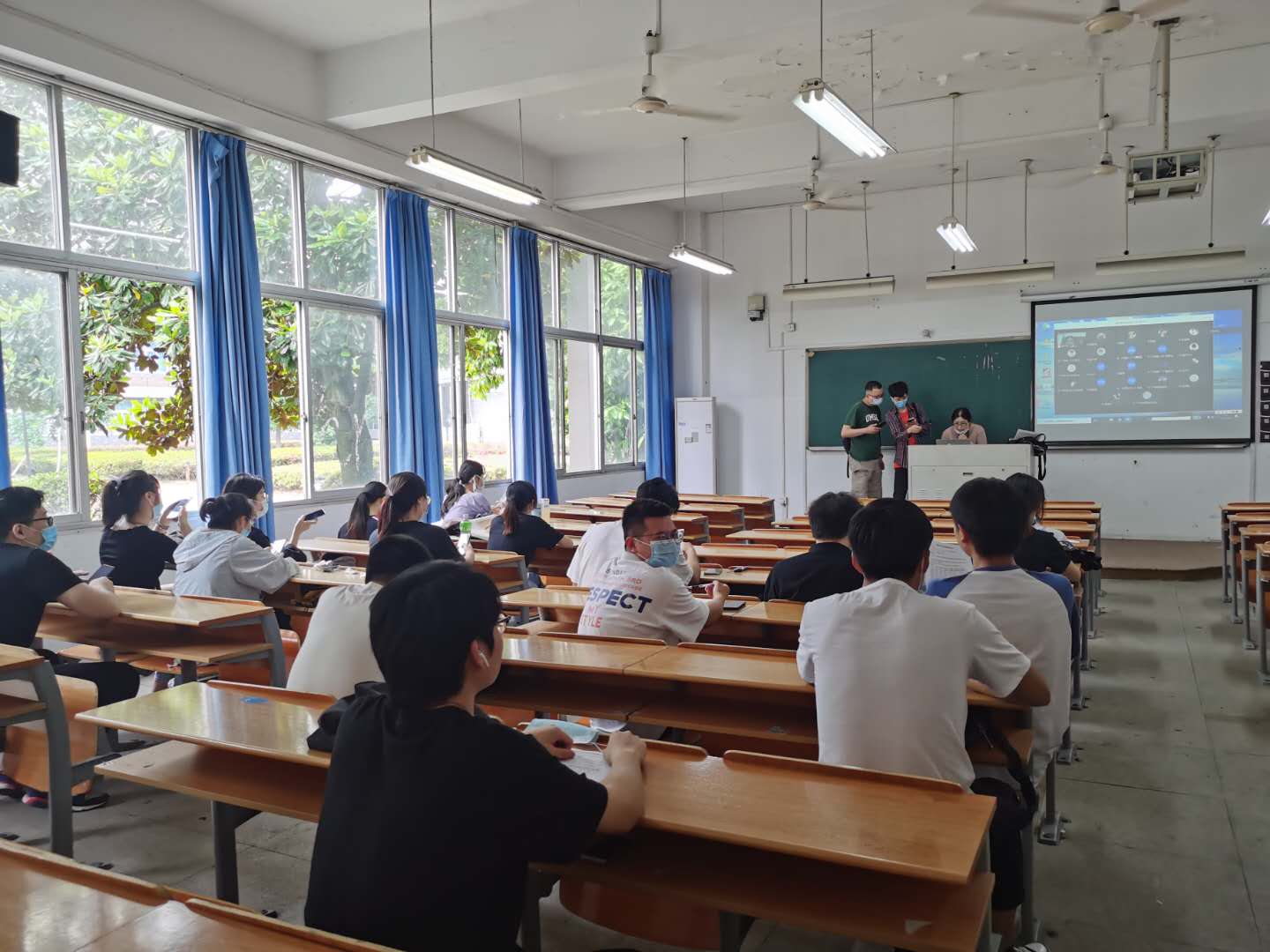 线下开学第一天,学院教学院长余向前老师和教学科长徐姝老师到每个教室巡查了上课情况,从开学第一天来看,老师和学生们上课的精神状态都较好,教学秩序井然。在今天的教学巡查过程中,我们发现学生自觉隔排就坐,并戴好口罩。现场教学环节,因为考虑到部分学生没有返校,魔镜号