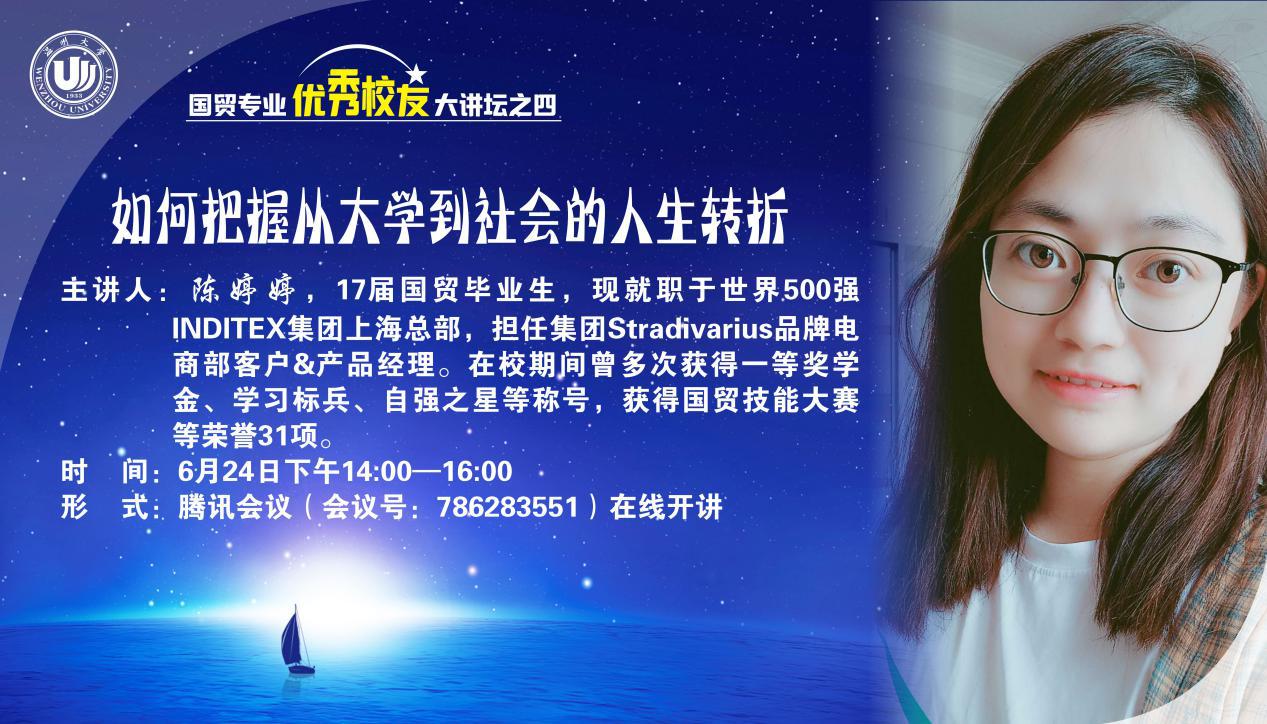 第三场优秀校友讲座是在2020年6月24日下午14:00-16:00,17届国贸毕业生陈婷婷学姐,她在校期间曾多次获得一等奖学金、学习标兵、自强之星等称号,获得国贸技能大赛等荣誉31项,现就职于世界500强INDITEX集团上海总部,担任集团Stradivarius品牌电商部客户&产品经理。她给同学们作了题为“如何把握从大学到社会的人生转折”的线上经验分享会。学姐针对许多同学进入大学后对未来没有明确的想法的情况,提出五点建议:1、在大学期间要找到自己的方向。对很多同学来说,寒暑假是做兼职的好时机,但对于兼职的选择,学姐郑重建议:以自己的专业为求职方向,做与专业有关的兼职。兼职是为了积累经验,了解行业,提前经历有助于培养你在工作中的各项品质。在大学期间应该明确自己的求职方向,抓紧机遇。2、要培养不怕吃苦、自信的品质。对于很多同学不断碰壁受挫的疑惑与焦虑,学姐认为:无论什么时候不要轻易认同别人对你的否定,要去证明自己的能力,不要放松自己。在实习方面要把眼光放得长远,不要怕吃苦,要有自信。在撰写求职简历时要明确重点,不要用千篇一律的模板,数字可以更加直观地体现内容。3、大学生最重要的是专业课的学习,这是我们的本职工作。在大学期间学习成绩会影响到奖学金评比和比赛的各项奖状,这些都是将来面试中可用的材料。4、学好英语很重要。在面临工作时,英语水平不止体现在书面上,口语也同样重要,花时间学一定是有帮助的。5、平衡好工作和学习的关系。大学期间接触同龄人的机会居多,如果有心仪的选择大胆去追求,但不论男生女生都要保护好自己。