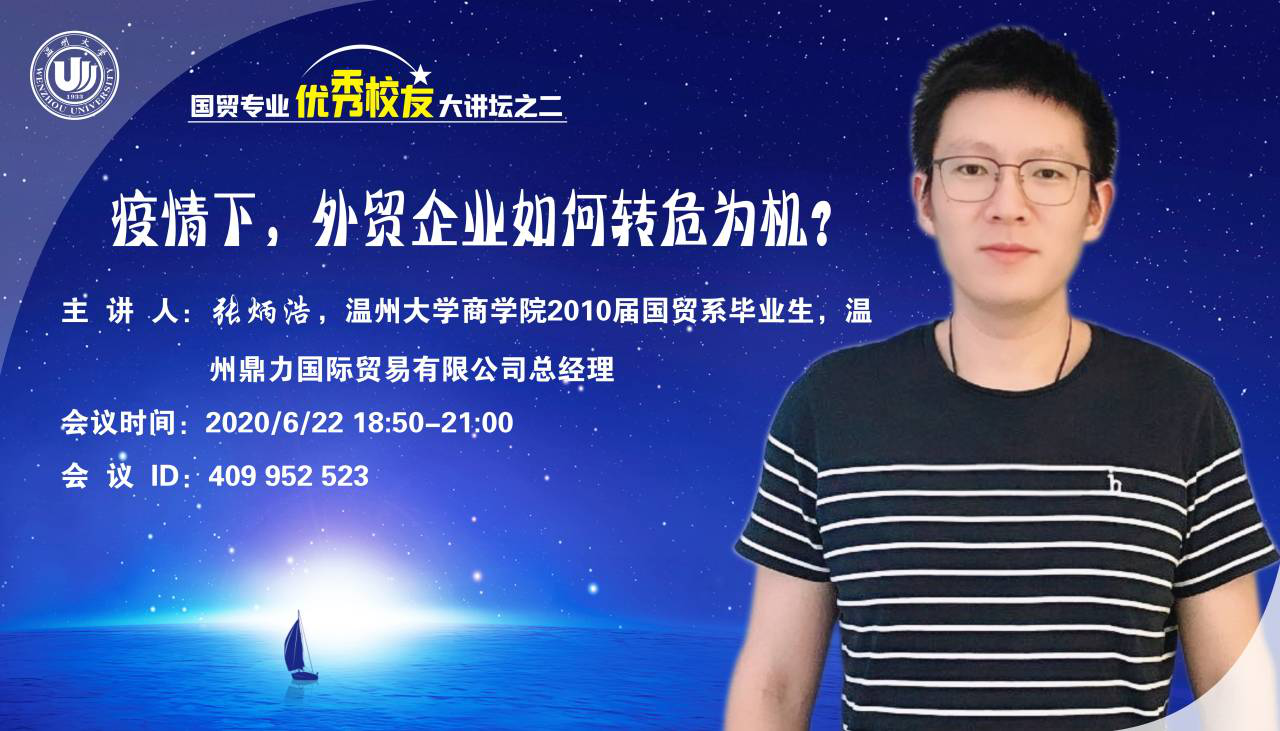 第二场优秀校友讲座是在2020年6月22日晚上18:50--20:00,国贸专业10届毕业生张炳浩学长,现为温州鼎力国际贸易有限公司总经理,他为同学们作了题为“疫情下,外贸企业如何转危为机”的线上经验分享会。张炳浩学长毕业后先是在一个外贸公司工作了四年,之后他毅然选择在温州自主创业。他凭借15万美金创立公司,如今公司年收益500万美金,六年的时间如何能实现这么大的转变?对此他毫不掩饰地夸赞道:“是我的团队和我们企业的文化不断支撑我们走到了今天。”以客户为重心,全力服务客户,与客户做好沟通争取客户的谅解与支持,企业在与客户的沟通中建立了更深厚的友谊,通过反省自身提升服务质量并扩大客户群体,这是学长关于企业的发展思路。期间谈到广交会,学长建议到:广交会企业应该提早准备好要展示给客户的内容,让客户一目了然,交谈时营造轻松愉悦的氛围,吸引老客户新客户的新订单。对于给学弟学妹的建议,学长说:“要专注专业知识,注重职业生涯规划,目标明确,外语能力一定要过关。”