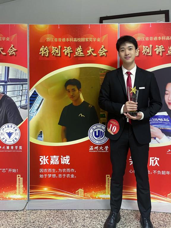 “学习标兵”称号; 负责多项省级、校级课题,撰写论文被SCI期刊录用;在“挑战杯”大学生课外学术科技作品大赛上获国赛二等奖、国赛三等奖和浙江省特等奖,在全国大学生英语能力竞赛上获二等奖、浙江省职业生涯规划大赛一等奖等高含金量奖项;2021年获得全省仅10人的本科高校国家级奖学金特别评选资格……据不完全统计,他已经获得国家级奖项4项,省级奖项12项,校级奖项40余项。