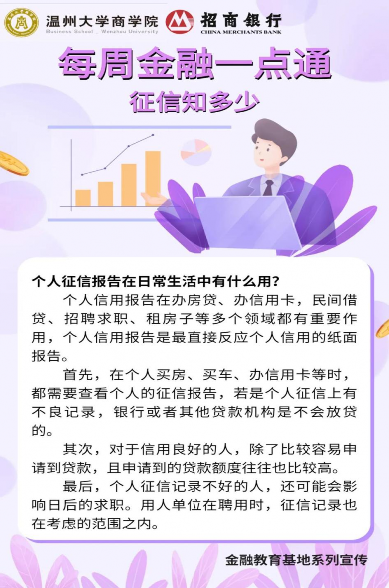 联合招商银行温州分行以防电信诈骗、银行卡知识、保险知识、断卡知识等主题为内容制作 “每周金融一点通” 金融知识宣传海报,作为金融教育基地的特色宣传活动。宣传海报除在魔镜号