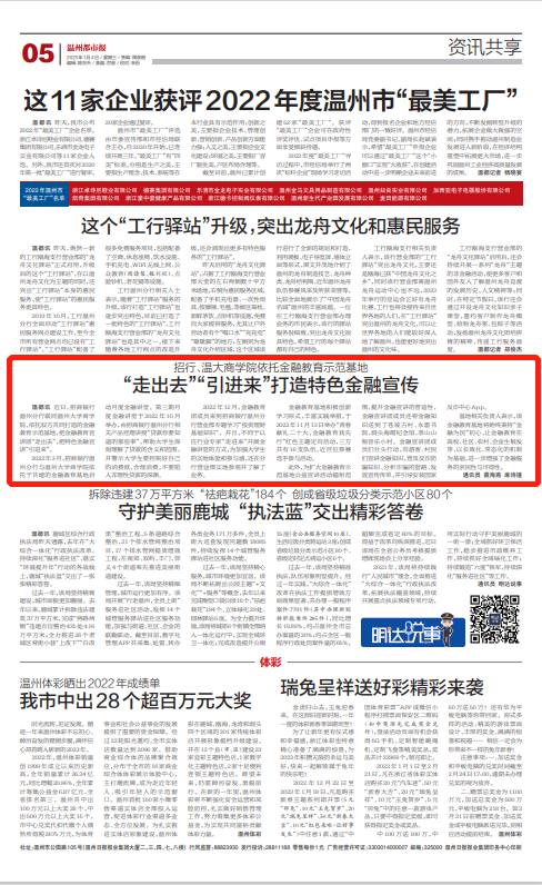 依 托于共建的金融教育基地启动月度金融讲堂。第三期月度金融讲堂于2022年10月举办,由招商银行温州分行相关产品经理讲授“贷款你要知道的那些事”,帮助大学生深刻理解了贷款的含义和范围,并警示大学生要控制好自己的消费欲,合理消费,不要陷入非理性贷款的深渊。