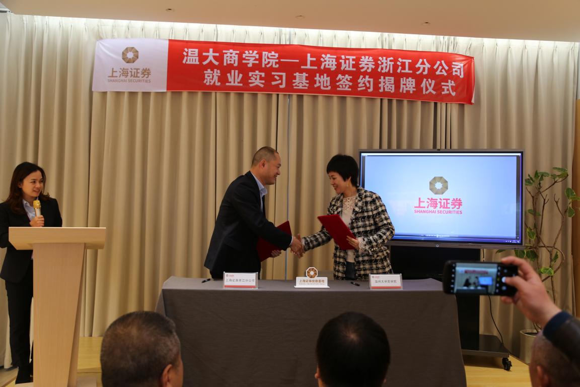 双方在投教基地举行了就业实习基地签约揭牌仪式。上海证券浙江分公司总经理金洛川介绍,上海证券浙江分公司成立于2012年6月,是上海证券在全国范围内组建的首家分公司,同时也是国务院批复设立温州“金改”试验区后在温州区域落户的第一家分公司。下辖浙江辖区22家证券营业部。浙江分公司秉承“开放、包容、规范、协同”的核心理念,覆盖浙江,服务全省,以最佳产品和服务为指引,加大互联网金融实践,不断提升客户体验,为广大投资者提供证券经纪、财富管理、投资咨询等全方位的综合金融服务,努力成为“特色鲜明、区域领先、品牌知名”的优质券商。金洛川总经理希望通过本次就业实习基地的建设,加强双方人才合作,大力开源拓岗。为毕业生就业拓宽新空间,实现人才培养和社会需求的有机结合。