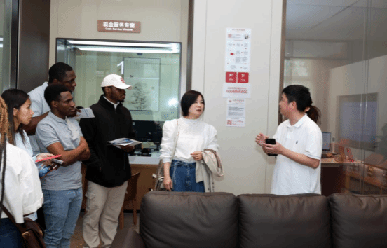 金融工程系学生对营业部的各营业区域进行参观,分行工作人员依次介绍了网点客户接待区、理财专区、公众教育区、自助体验区等各区域设施和功能。在客户接待区,学生们了解了银行卡的基础知识,对卡通联名银行卡面爱不释手,同时,还体验了银行为客户提供的桌面充电设施;在理财专区,学生们了解购买理财产品的基本步骤,知道为什么购买理财产品要做双录,以及如何保护自己的知情权和自主选择权;在公众教育区,学生听了银行老师对防范非法集资、防范电信诈骗和银行卡安全使用的知识介绍;在自助体验区的征信查询机前,部分学生还拿出身份证,打印了自己的第一份征信报告,了解了良好的征信记录对自己意义。值得一提的是,本次活动参加的学生还包括了10余位金融工程系硕士留学生,为提升外籍学生的金融服务体验,分行营业部工作人员特意为其介绍了我行对境外人员提供的便利服务,如特设窗口、英文服务指南、外币兑换币种介绍等。