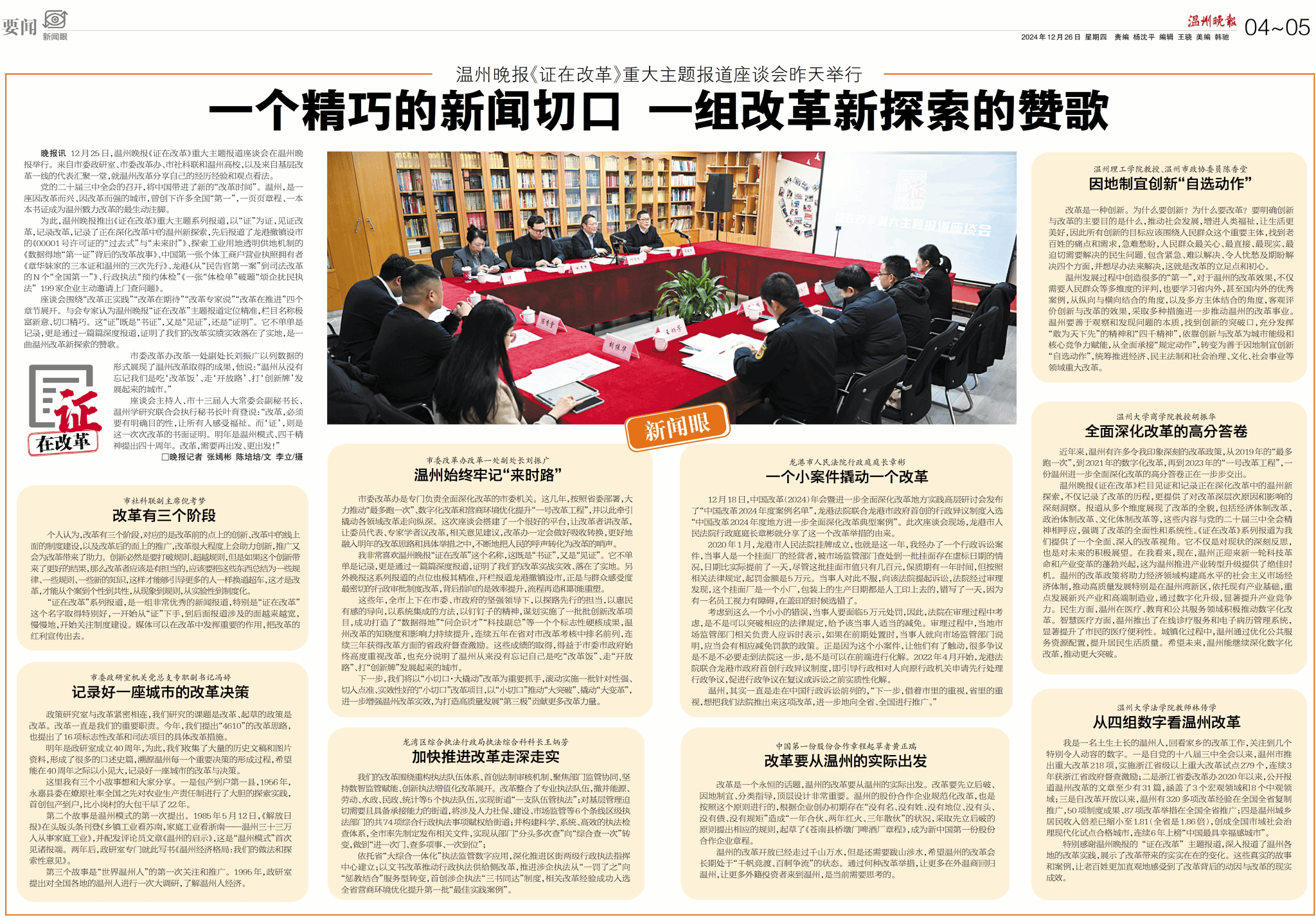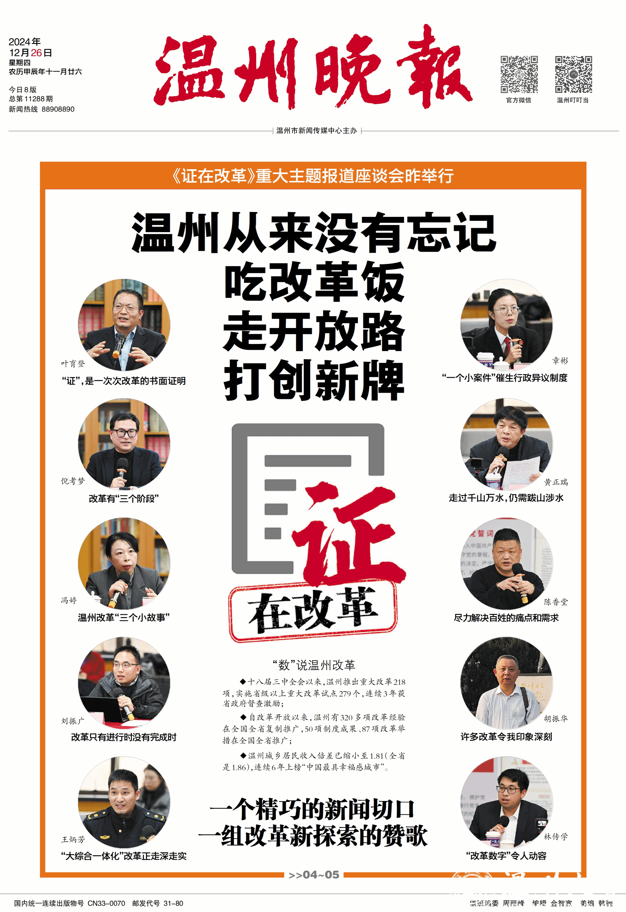 12月25日,温州晚报《证在改革》重大主题报道座谈会在温州晚报举行。来自市委政研室、市委改革办、市社科联和温州高校,以及来自基层改革一线的代表汇聚一堂,就温州改革分享自己的经历经验和观点看法。