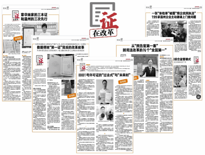 为此,温州晚报推出《证在改革》重大主题系列报道,以“证”为证,见证改革,记录改革,记录了正在深化改革中的温州新探索,先后报道了龙港撤镇设市的《00001号许可证的“过去式”与“未来时”》、探索工业用地透明供地机制的《数据得地“第一证”背后的改革故事》、中国第一张个体工商户营业执照拥有者《章华妹家的三本证和温州的三次先行》、龙港《从“民告官第一案”到司法改革的N个“全国第一”》、行政执法“预约体检”《一张“体检单”破题“烦企扰民执法” 199家企业主动邀请上门查问题》。