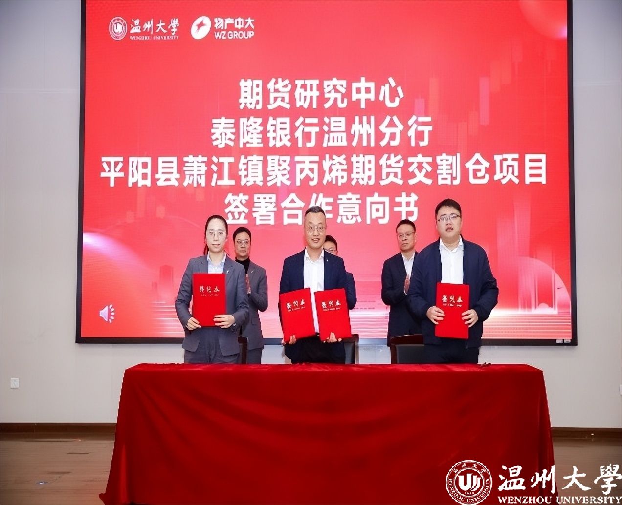 仪式上,双方共同为研究中心揭牌,并与泰隆银行温州分行、平阳县萧江镇聚丙烯期货交割仓签署合作意向书。同时,物产中大期货温州分公司被授予“魔镜号